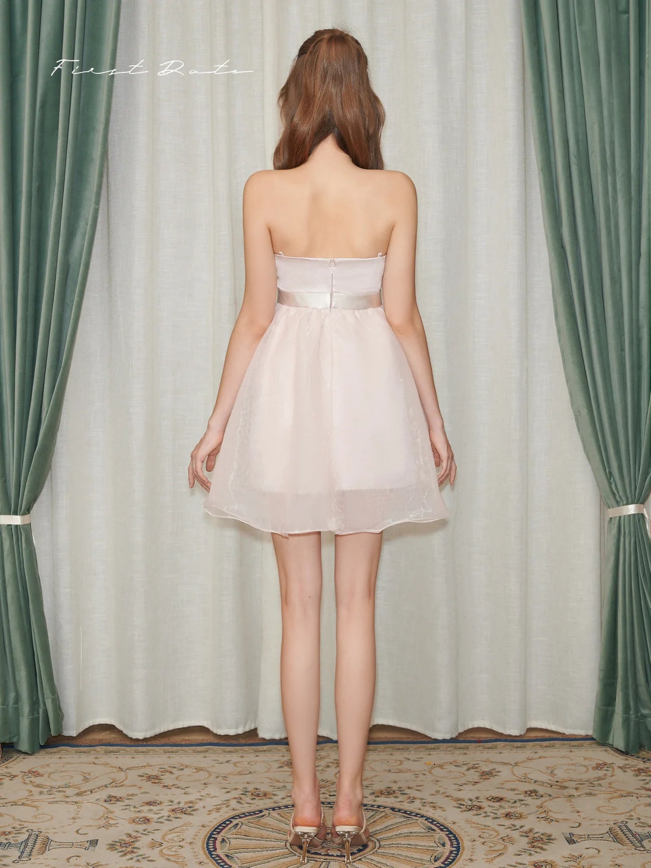 The dress is made from textured jacquard fabric layered with soft pink tulle, creating an ethereal feel. Handcrafted bow accents add a delicate, playful touch, while the detachable straps offer styling versatility for a personalized look. Its bouquet-style skirt features an asymmetrical ruffled hem, resembling petals in bloom, making this dress a perfect choice for any occasion where you want to stand out with grace and elegance.