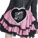 Crafted from structured velvet fabric with a slight stiffness for dramatic shape retention, this heart-shaped bag brings gothic romance to life. Intricate silver lace trim borders the dark heart, embroidered with blood-red roses and thorn motifs—whispers of a love letter.
