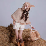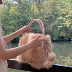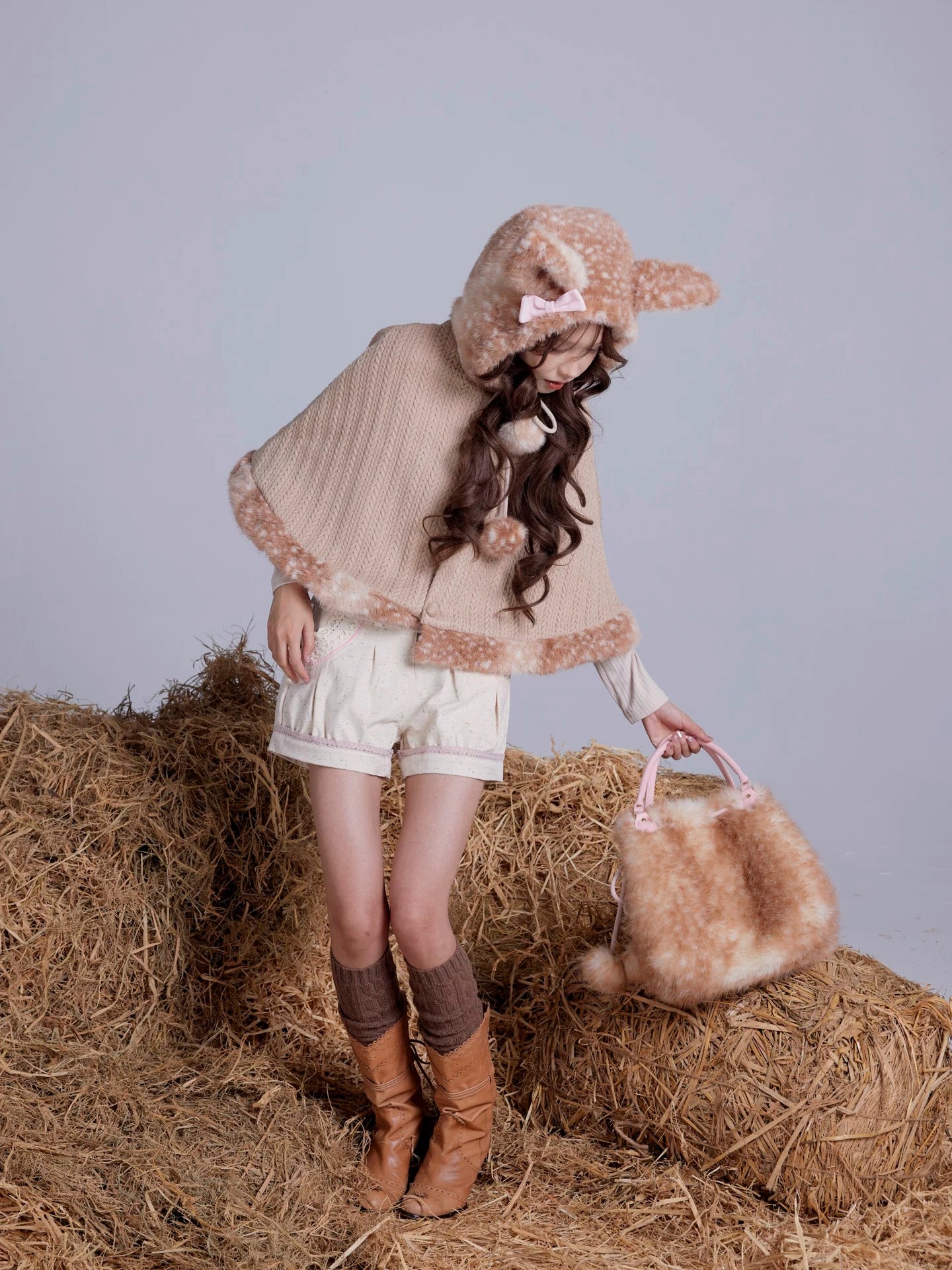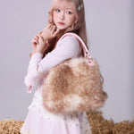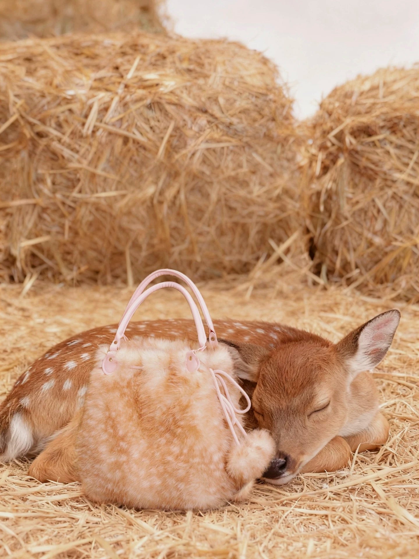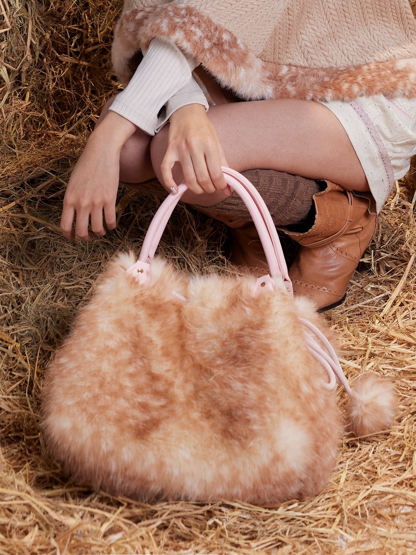 Made from eco-friendly faux fur in a delicate fawn print, it’s paired with pastel pink handles and fluffy pom-pom ties that bring out its Lulicore × coquette charm.