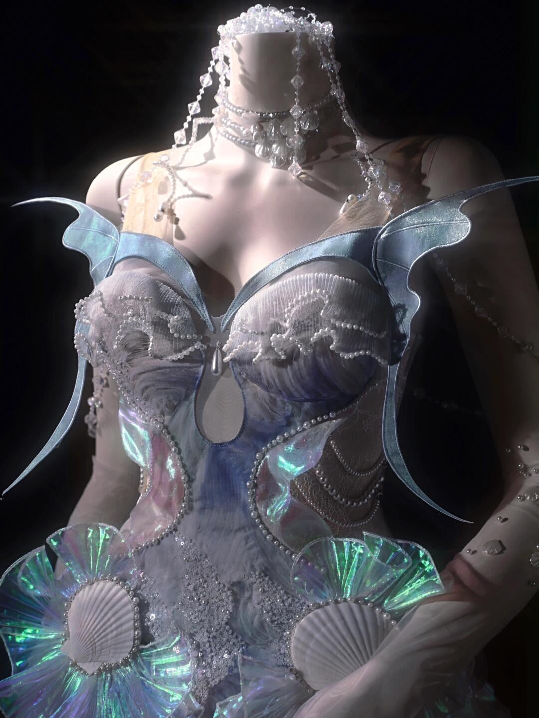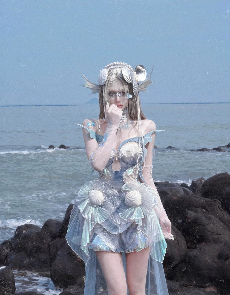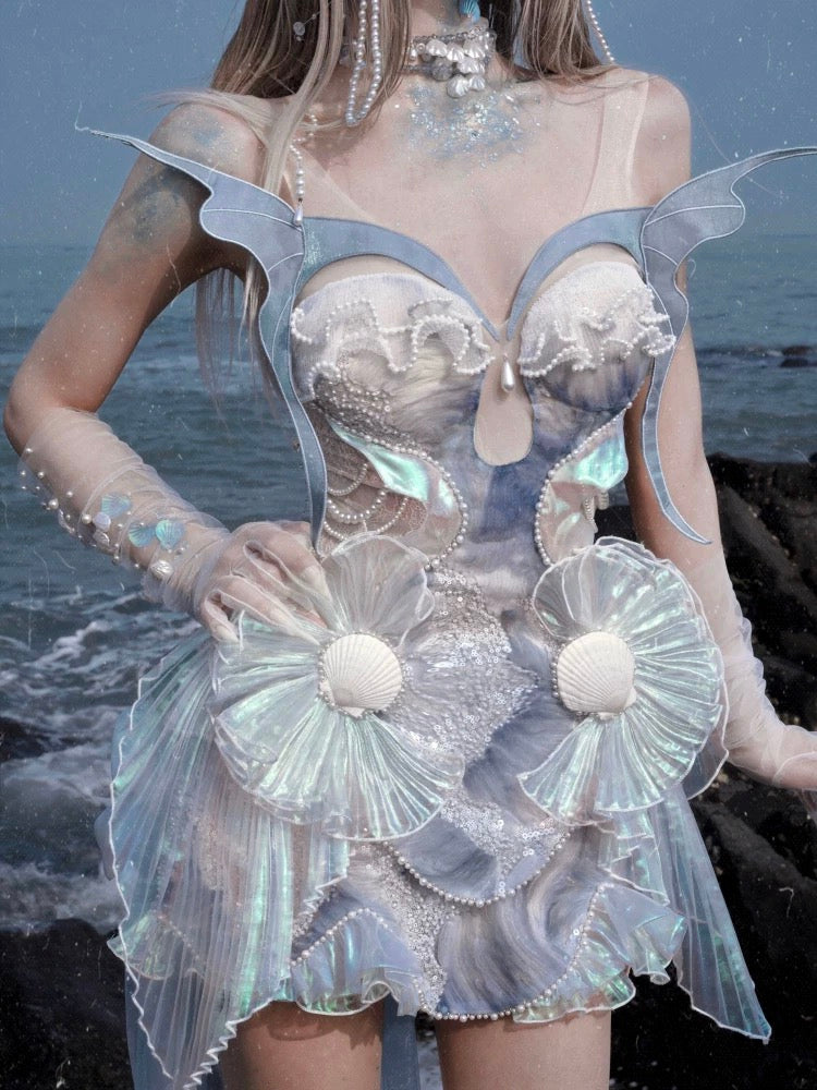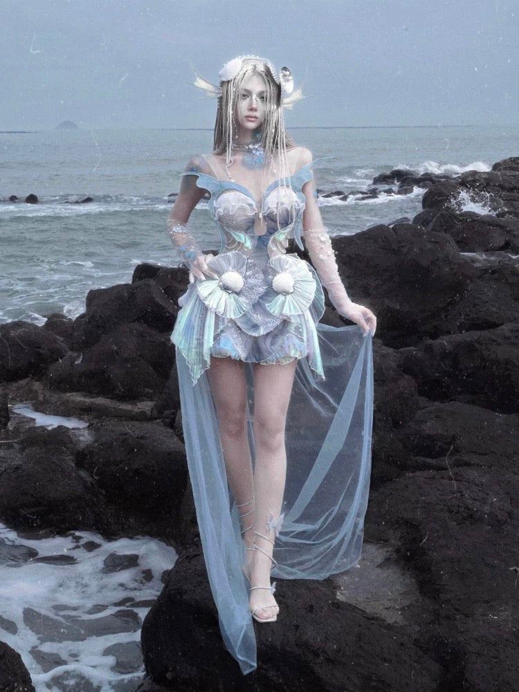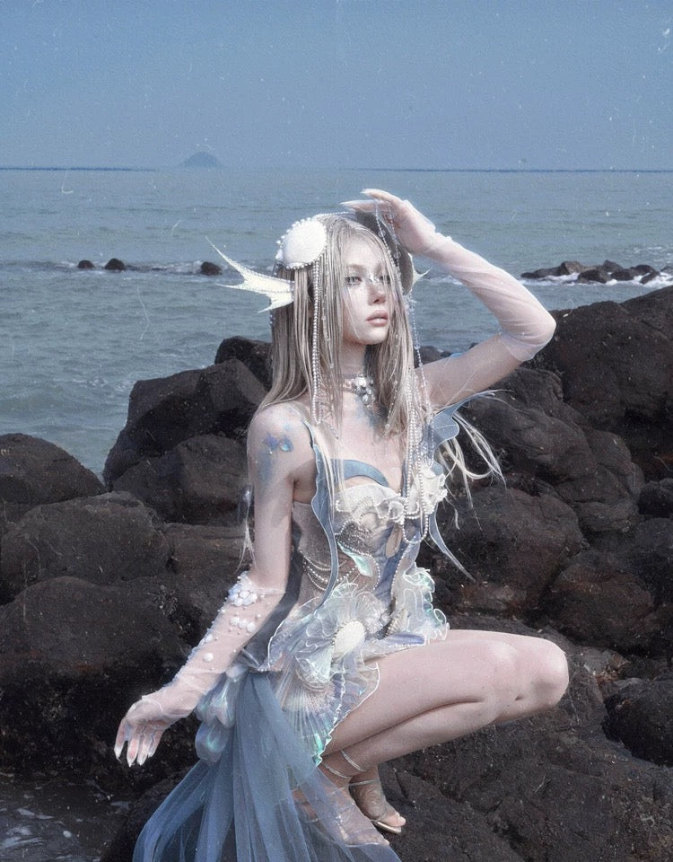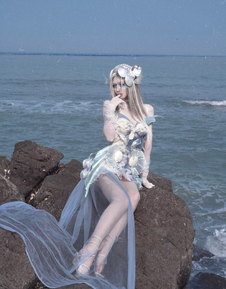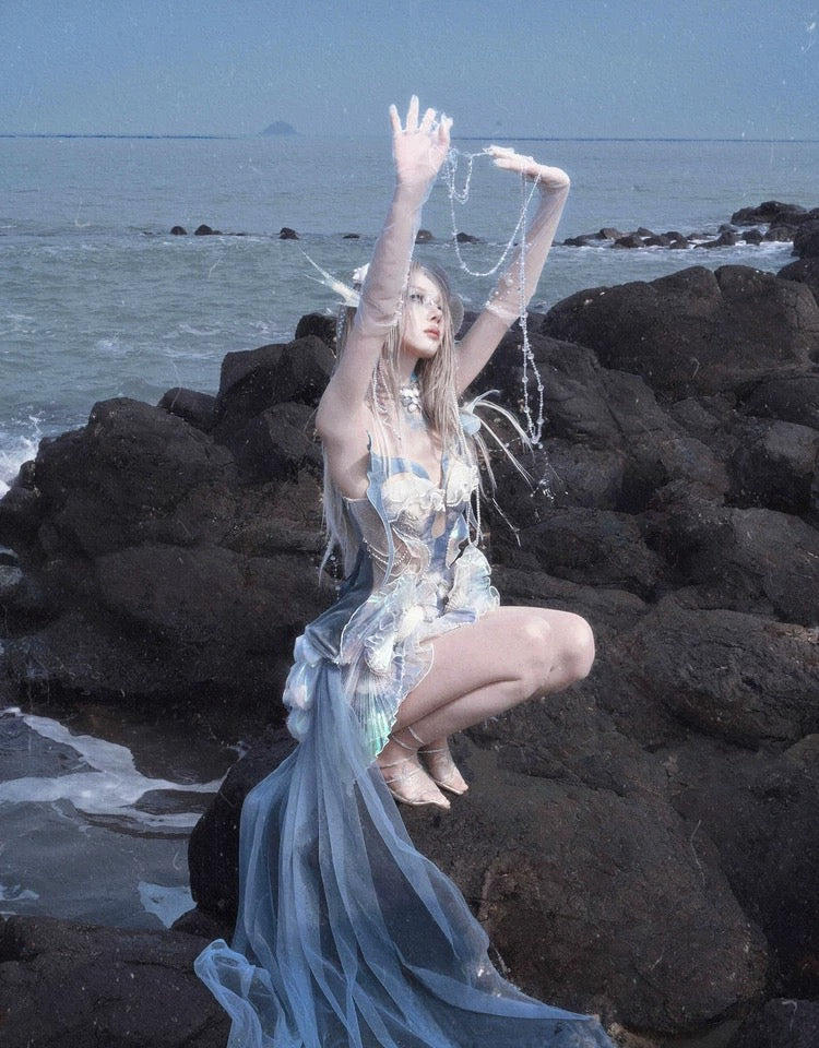 At the bust, pleated pearl lace connects to the sheer cutout like soft waves at the water’s edge. The abdomen is layered with shimmer organza and chiffon, flowing like scattered mermaid scales with every step. On the sides, iridescent pleats spiral like fins, decorated with tiny shell details—like treasures from under the sea.