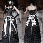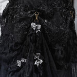 The front is adorned with handcrafted metal hooks and vintage rose trims. The soft train in the back creates a flowing silhouette, finished with a giant detachable satin bow. Inside, a sculpted petticoat and crinoline cage keep the regal volume in place.