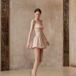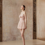 A vision of dawn wrapped in petals — this dreamy mini dress blooms with ethereal grace. Crafted in a delicate blush hue, it features a sculpted bodice adorned with a soft rose detail, flowing into a flared skirt with airy lace panels that flutter like mist-kissed petals in motion.
