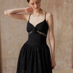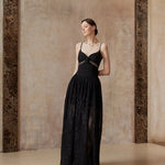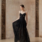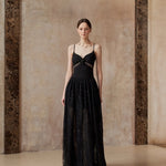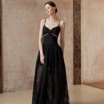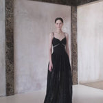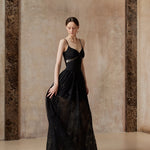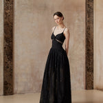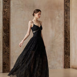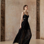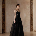 A gown woven from starlight and midnight whispers. This exquisite piece features a sleek bodice adorned with a delicate black rose and shimmering ribbon detail, flowing into a sweeping lace skirt sprinkled with sequins — like constellations scattered across the night sky.