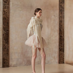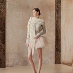 A soft whisper of moonlight woven into fabric — this ethereal shawl drapes gracefully over your shoulders or wraps delicately around your neck. Crafted with a lace-like knit, it floats with a weightless charm, evoking the elegance of a ballet veil drifting under silver light.