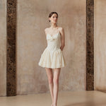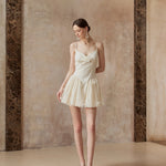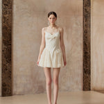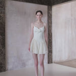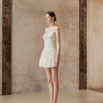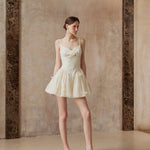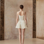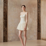 A dress that feels like a whispered love letter, written in soft ivory petals. The bodice is adorned with a delicate rose detail, while the lace-panel skirt flutters gracefully with every step, like pages of poetry caught in the wind.