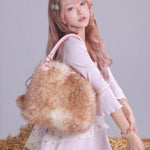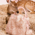 Made from eco-friendly faux fur in a delicate fawn print, it’s paired with pastel pink handles and fluffy pom-pom ties that bring out its Lulicore × coquette charm.