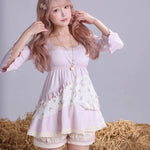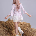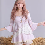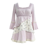 The soft stretchy knit fabric hugs gently for comfort, while the patchwork floral details and lace trim add a touch of vintage elegance. The charming bell sleeves are the highlight — fluttery, cute, and beautifully nostalgic — giving this piece a unique mix of retro romance and sweet modern charm.