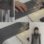 Its U-shaped neckline with layered lace ruffles and ribbon tie adds quiet sweetness, while the ribbed knit texture flatters naturally without feeling tight.