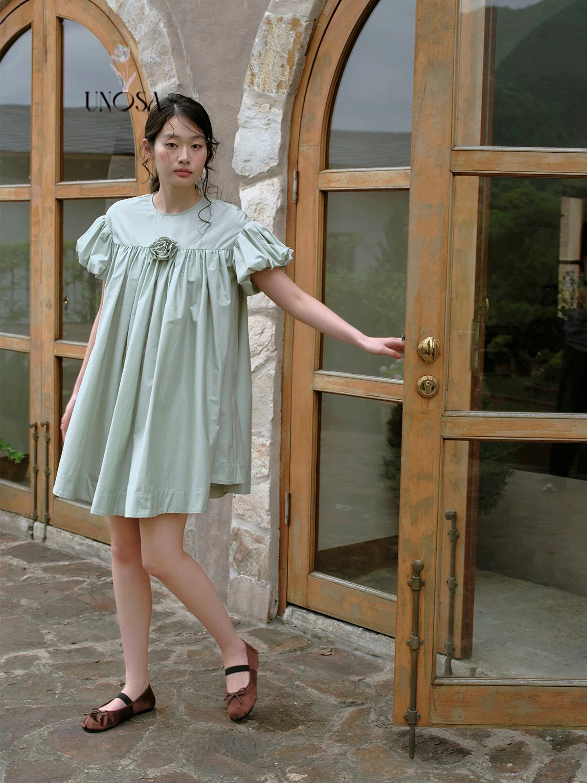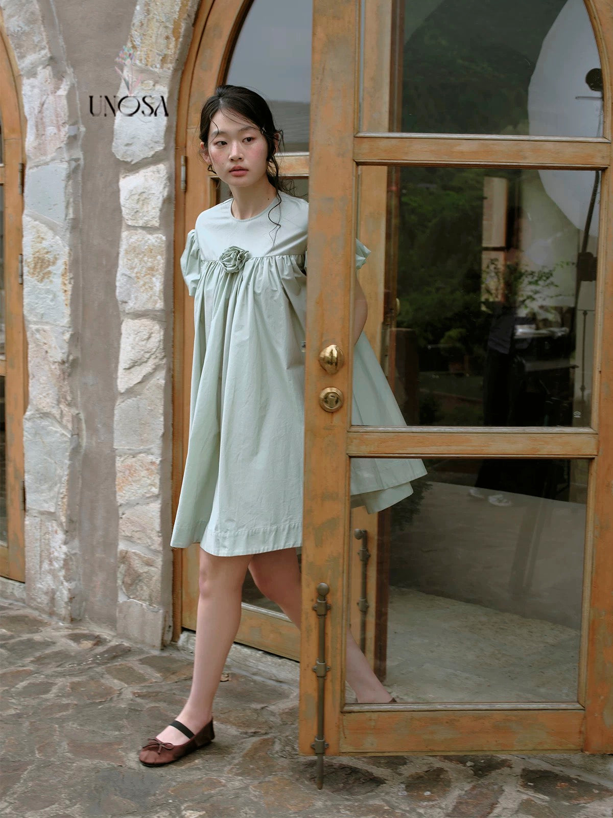ふわっと広がるシルエットに、パフスリーブと胸元の花モチーフ。プペ・ド・テ ミニドレスは、おとぎ話の中のティータイムを思わせるような一着です。淡いミントグリーンがやさしく肌を包み、見ているだけで心がふんわりとほどけていくよう。