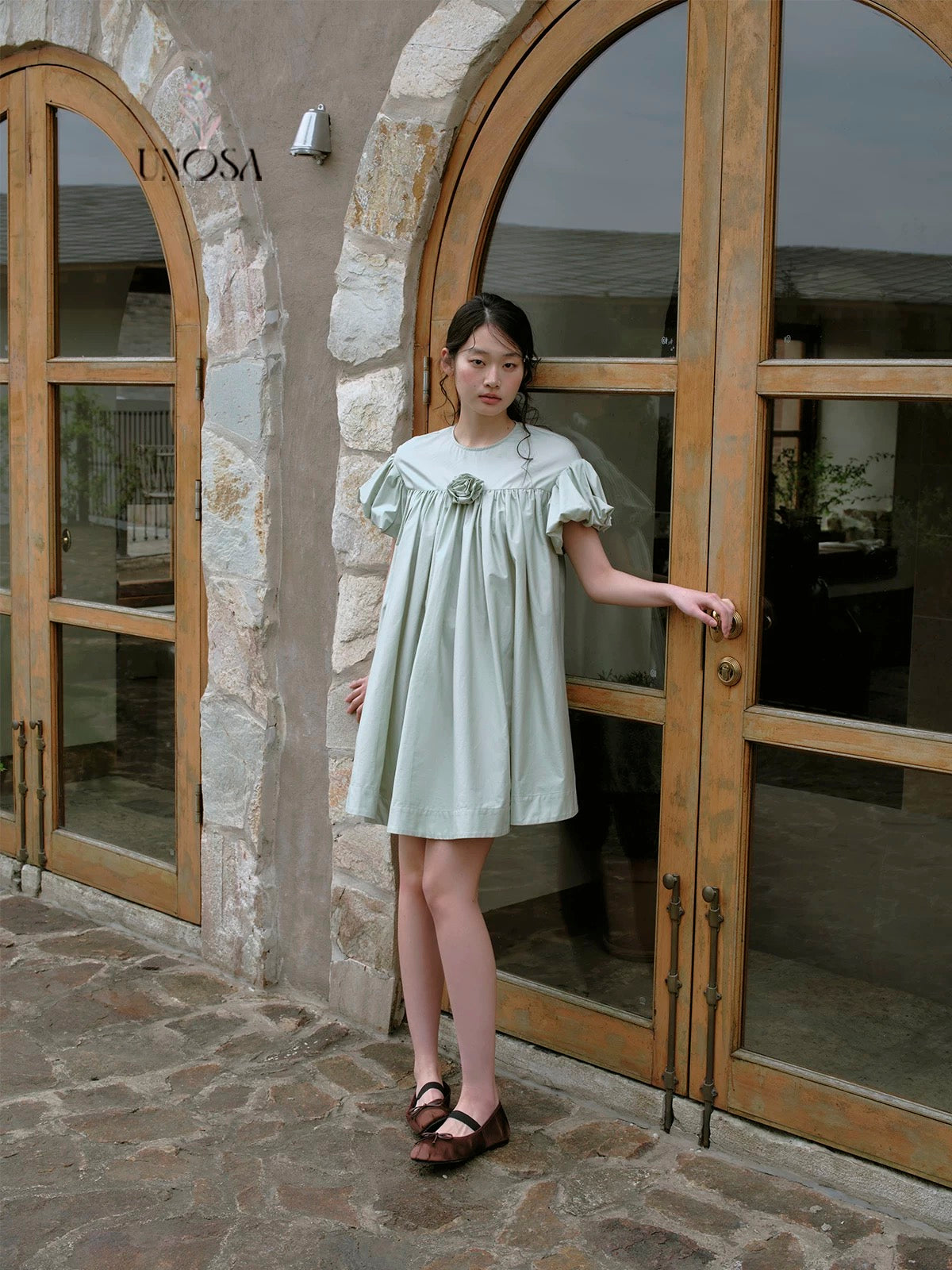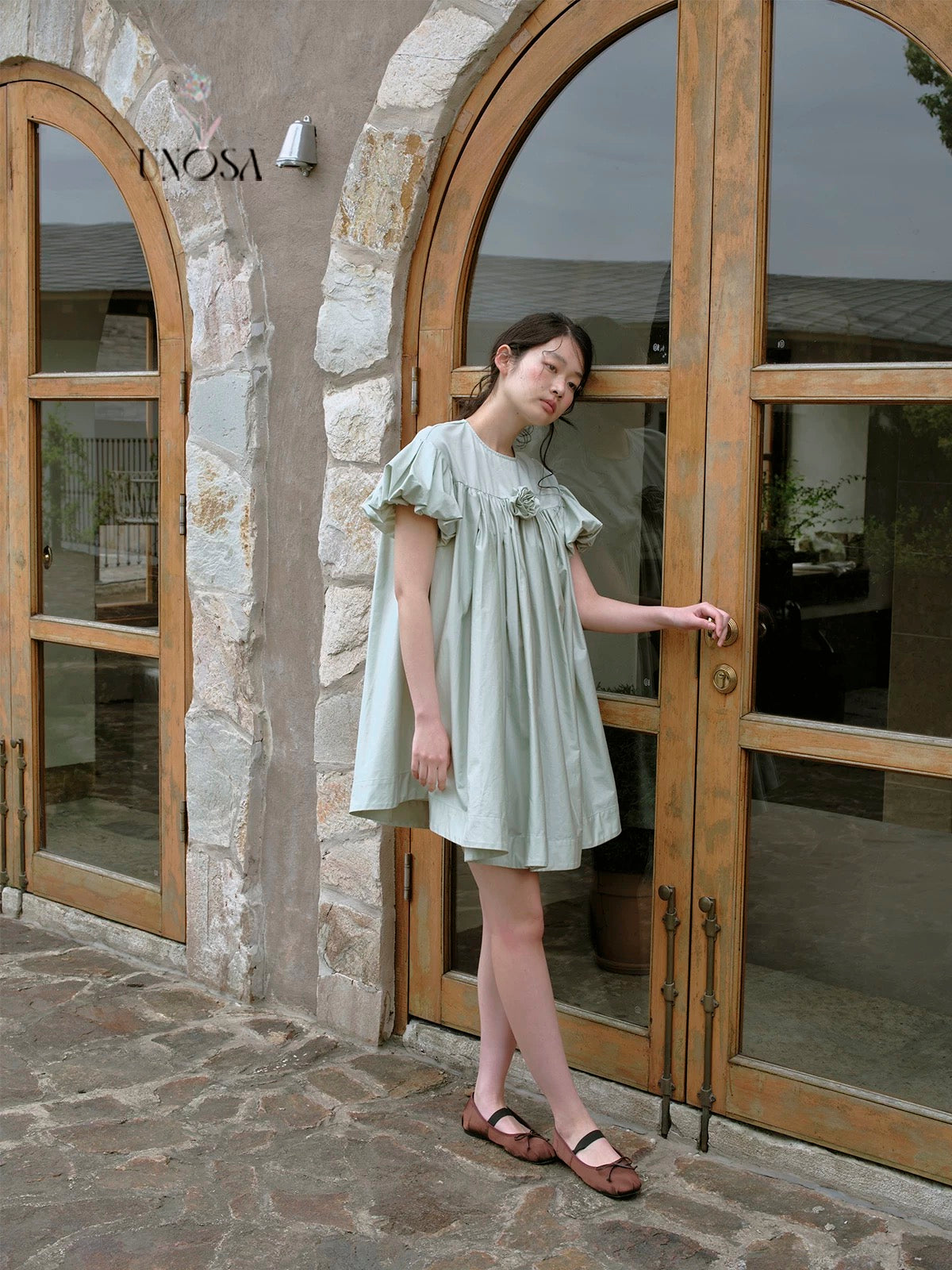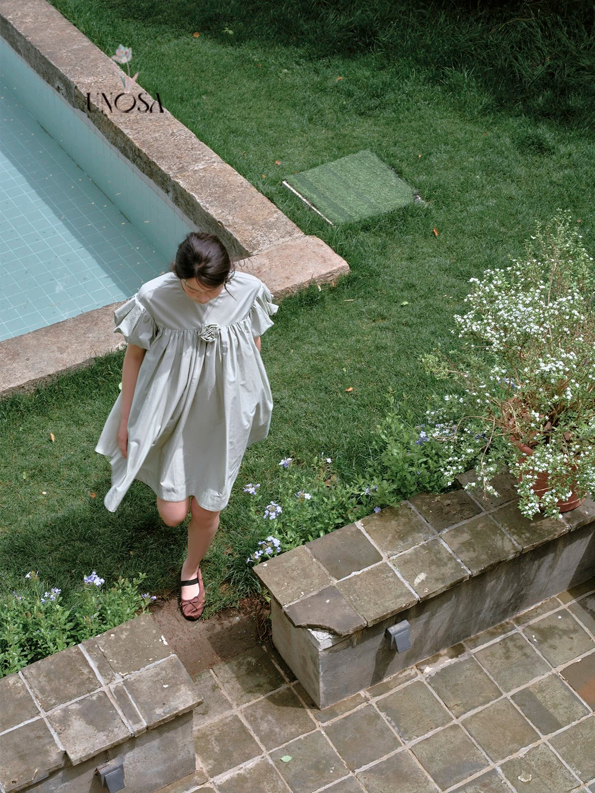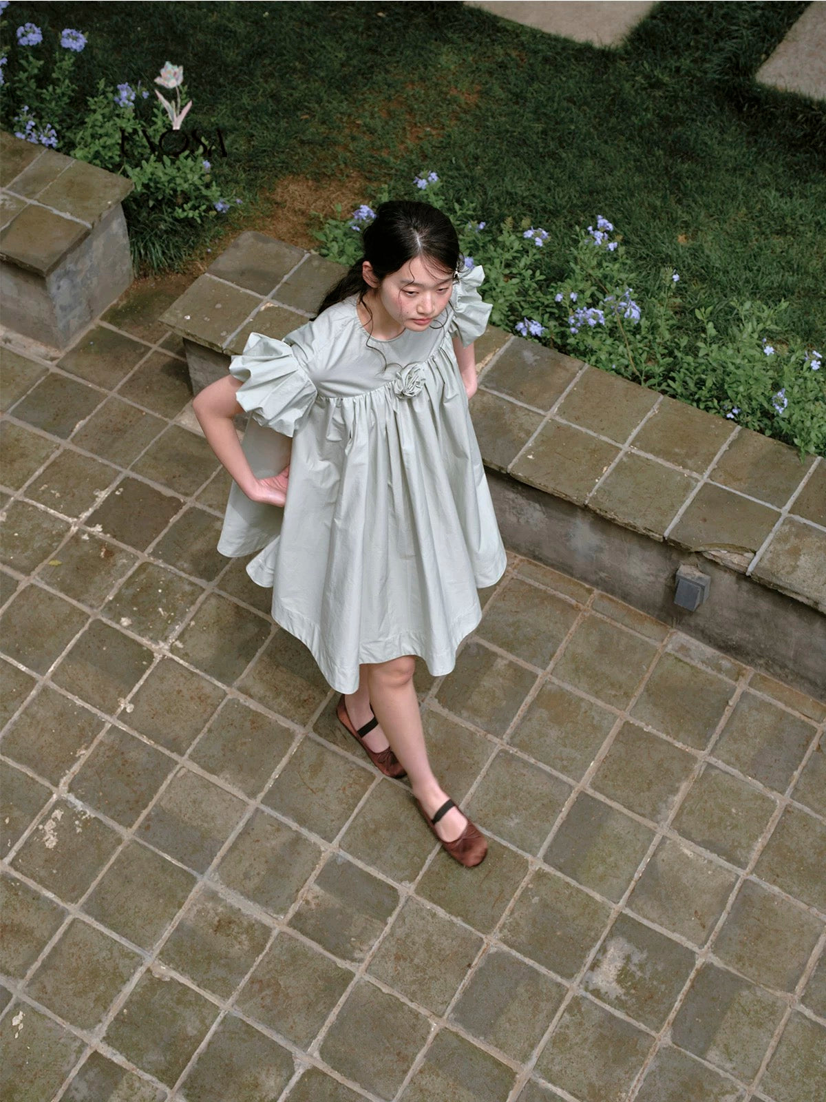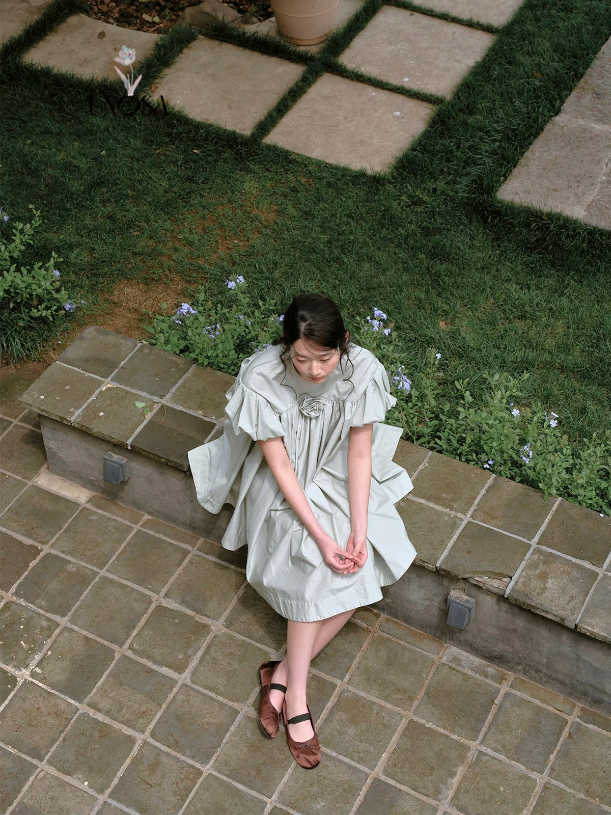 Like a doll ready for an afternoon tea, the Poupée de Thé mini dress captures a sweet and delicate charm. The misty mint color melts like sugar in milk tea, soft and dreamy. Puffy sleeves add a touch of whimsy, while the little rosette on the chest is like a floating petal in your favorite teacup.