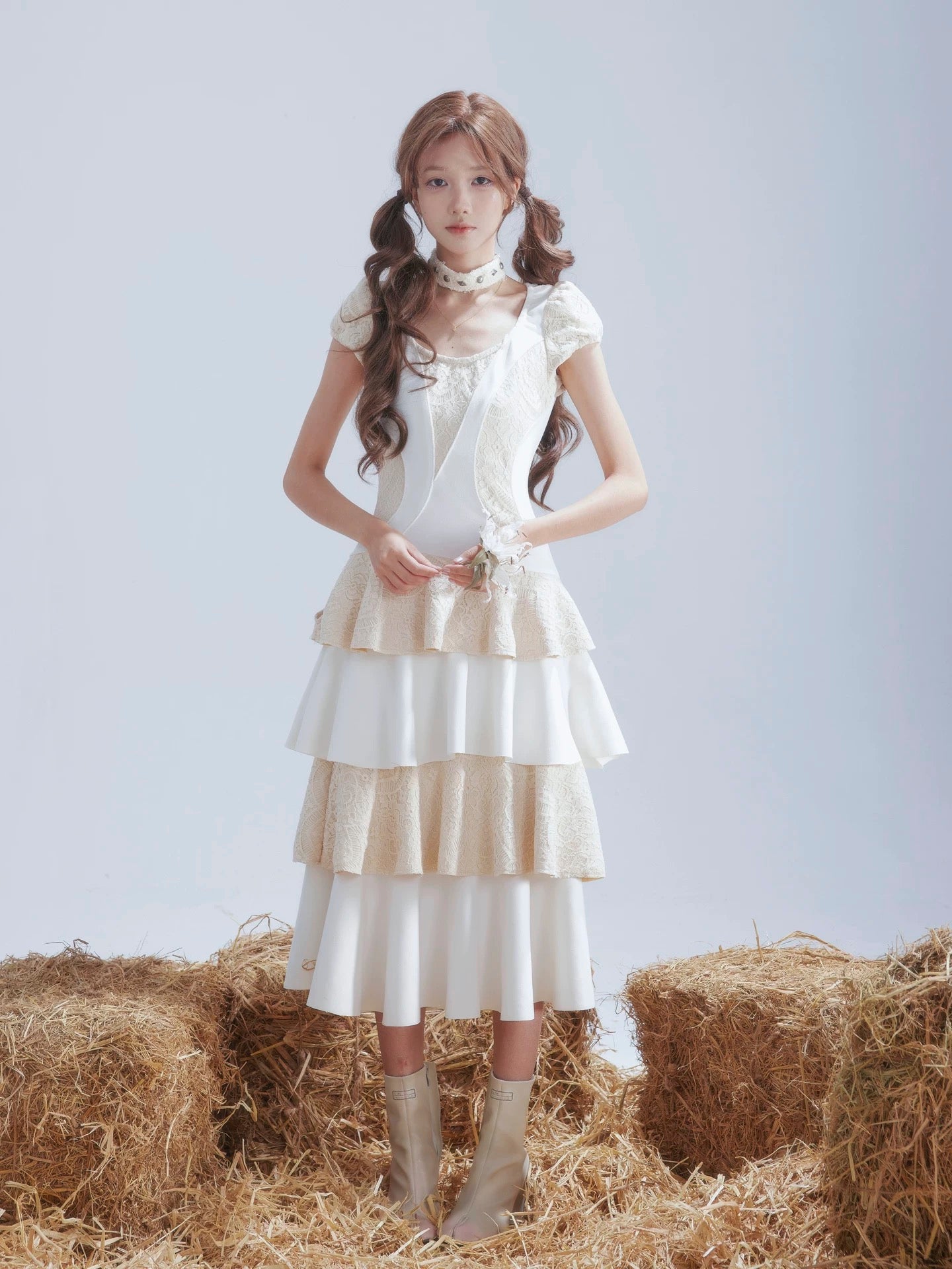 This enchanting dress features layered faux suede and lace panels, cascading in irregular tiers like pages of a forgotten fairytale. The puff sleeves bring a touch of innocence, while the structured waistline carries the quiet strength of a warrior’s resolve.