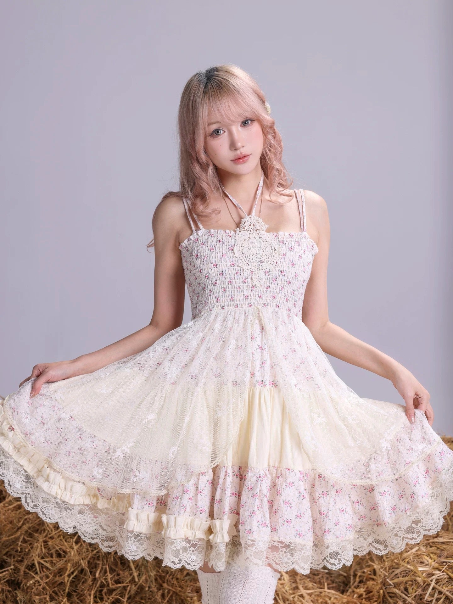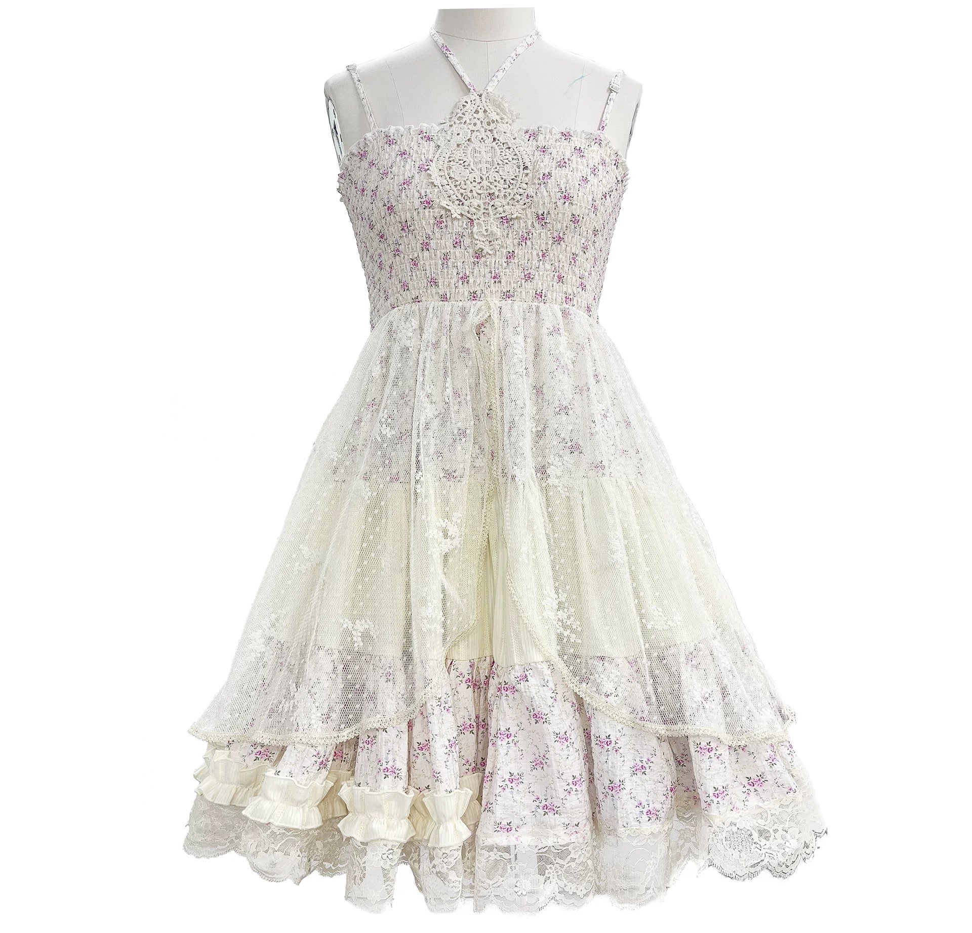 The Harvest Garden JSK is crafted from delicate floral fabric layered with sheer lace, creating a three–tier skirt that sways like a meadow in the breeze. The shirred bodice offers comfort and flexibility, while adjustable straps ensure the fit. Each ruffle and lace hem evokes the charm of a fairytale harvest festival — both romantic and ethereal.