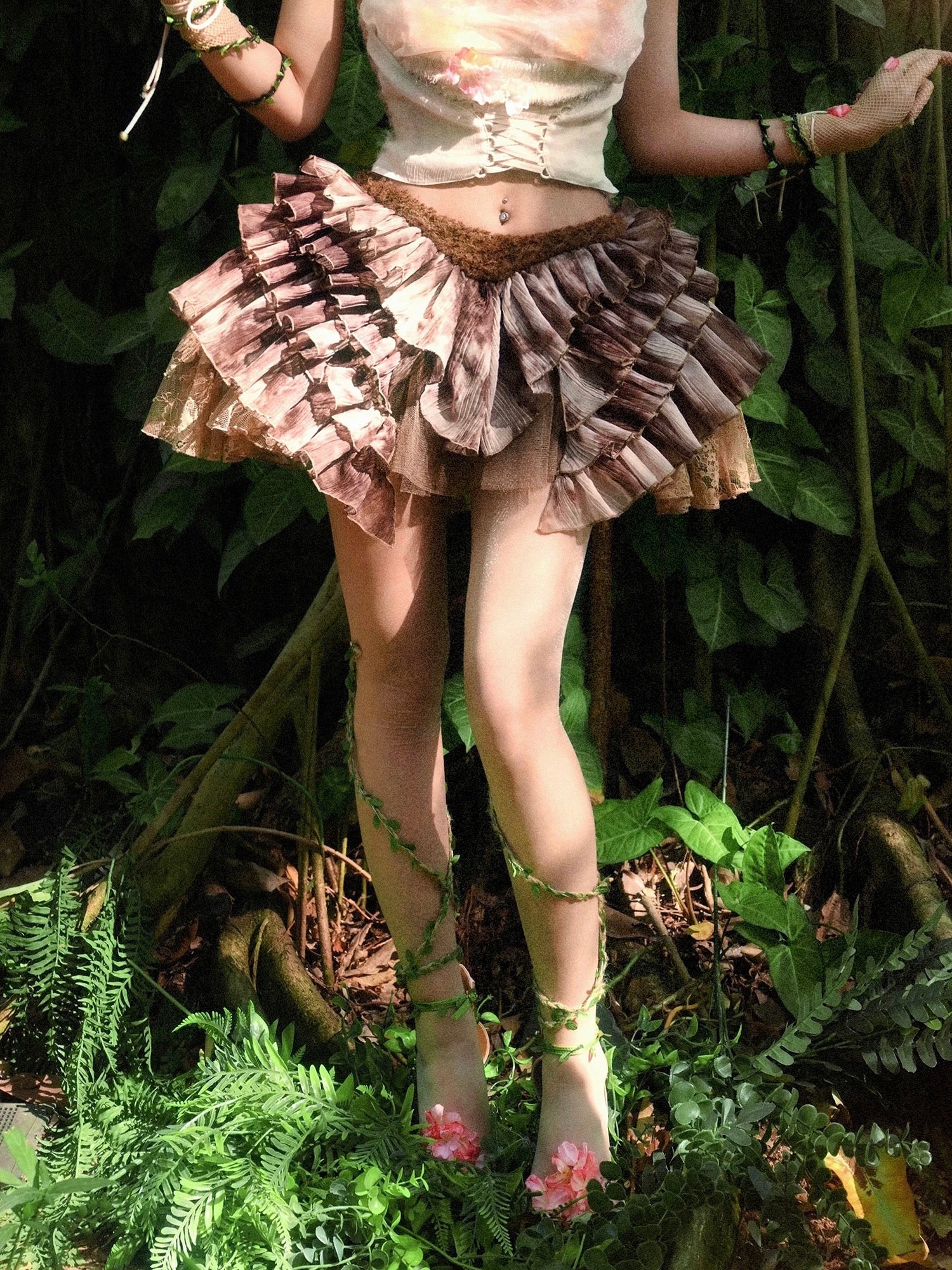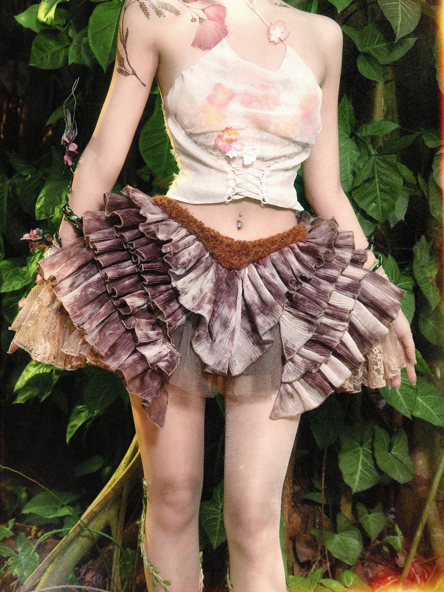 The skirt features four layers of brown pleated tie-dye fabric, supported by stiffened tulle that forms a delicate wing-like shape, reminiscent of a dead leaf butterfly in flight. The light, scale-like fabric at the hem flutters with every movement, adding an enchanting touch of grace. The final layer is made from soft lace, adding a hint of femininity and ethereal charm.