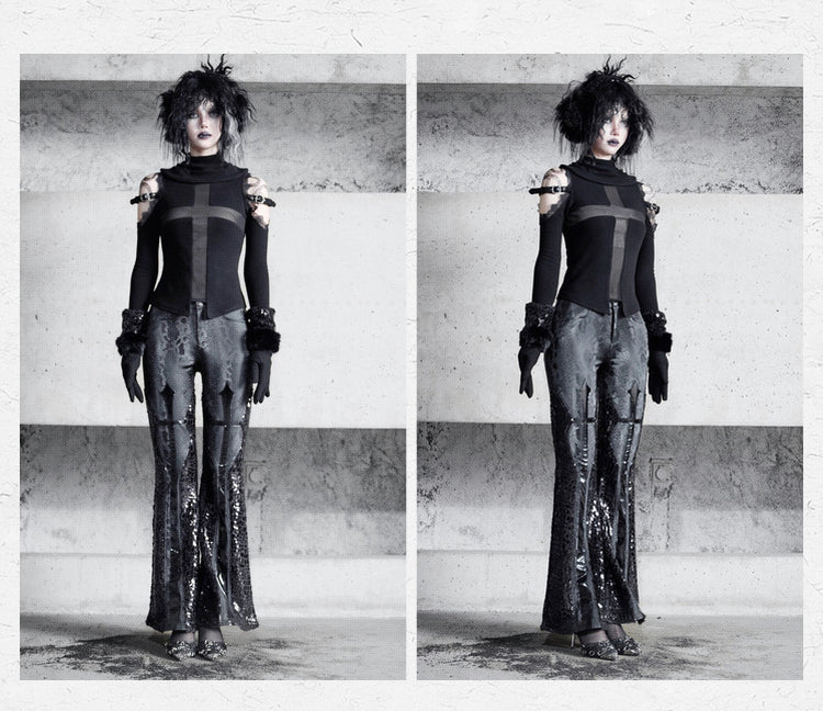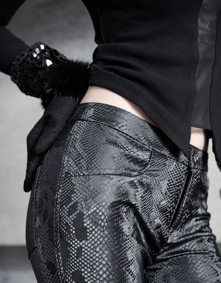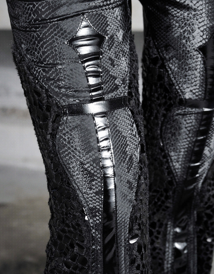 Crafted from elastic fabric with a snake scale pattern, these pants wrap around the curves of the hips and thighs above the knees. The snake pattern print on the glossy black material subtly shimmers as light dances across it. Cross-shaped shiny black patent PU leather runs from the mid-thigh straight down the leg, resembling skeletal structures in the dark. The smooth elongated lines accentuate the long and straight legs. Plush fabric panels on the sides create an expanding visual effect, with tightness at the top contrasting starkly with the loose flare at the bottom, revealing slender ankles. Tapering gradually from the joints to the hem, the pants form a fluid and unrestricted sense of line.