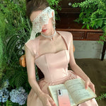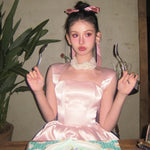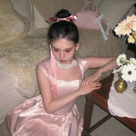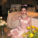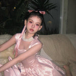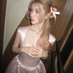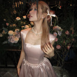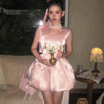 A dreamy, fairytale-inspired dress that flows like a delicate melody, reminiscent of an enchanted ballet performance. Featuring soft layers of shimmering tulle, elegant lace trims, and a romantic ribbon tie, this dress is perfect for those who love a touch of magic in their wardrobe.