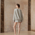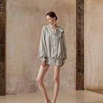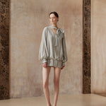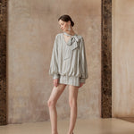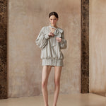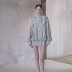 A dreamy shirt dress that feels like a soft melody under the moonlight. Designed with billowing sleeves, a graceful bow-tie neckline, and a relaxed silhouette, it blends elegance with ease. The subtle striped fabric shimmers like silver shadows, creating a timeless charm that moves with every step.