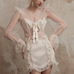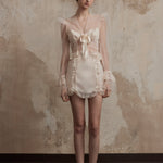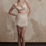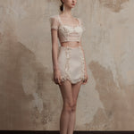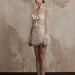 The Lueur de Lune Skirt is a delicate dream woven in sheer nude mesh, caressing the skin with an ethereal touch. The intricate lace detailing on the sleeves and hemline adds an air of refined romance. The elegant V-neckline is adorned with a satin ribbon and butterfly knot, enhancing the balance between grace and sophistication.