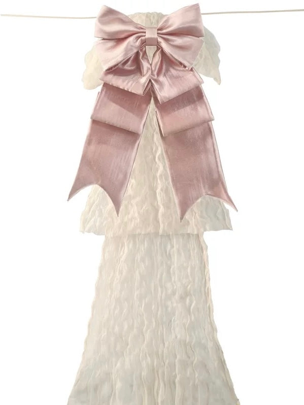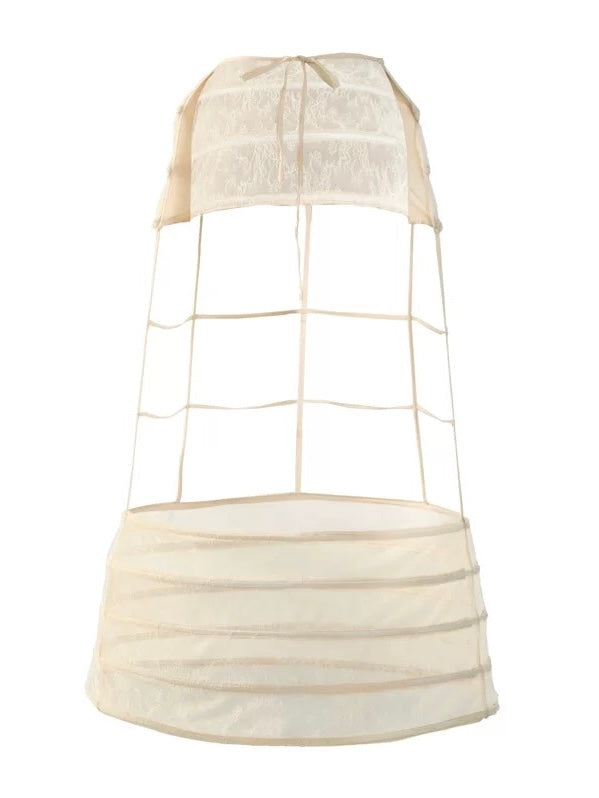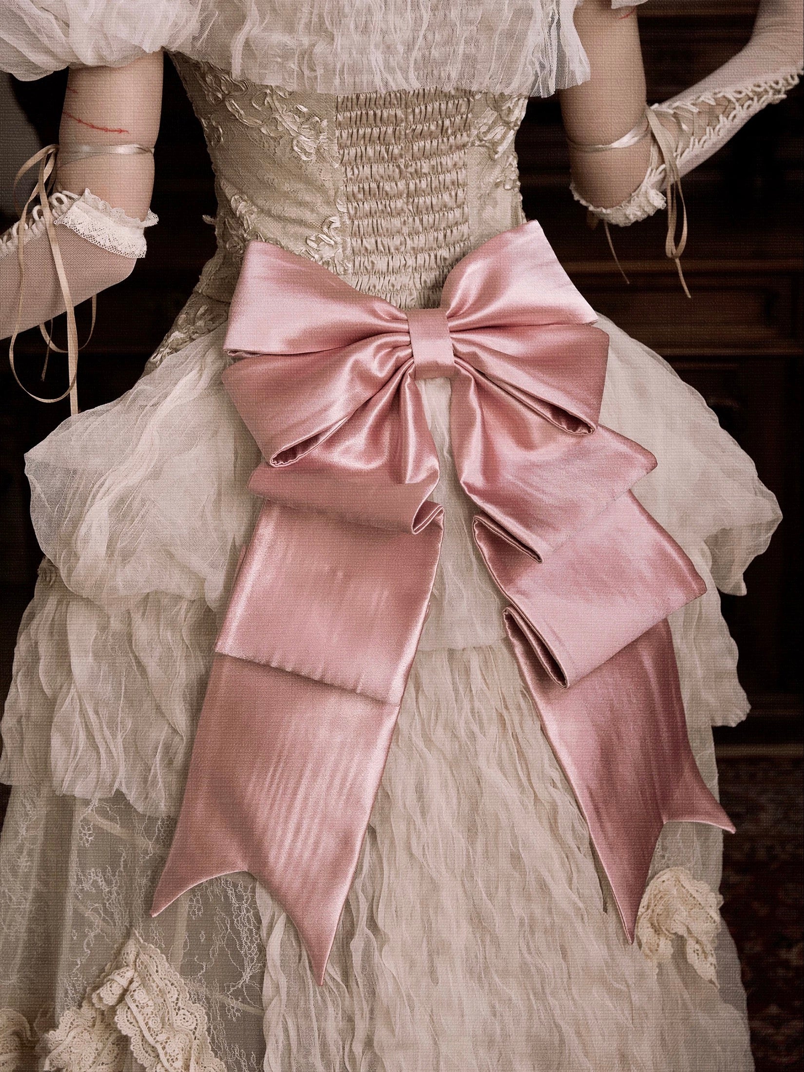 The front is adorned with handcrafted metal hooks and vintage rose trims. The soft train in the back creates a flowing silhouette, finished with a giant detachable satin bow. Inside, a sculpted petticoat and crinoline cage keep the regal volume in place.