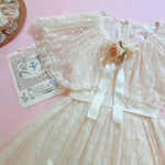 Featuring soft ivory hues, a layered tulle skirt, and charming ribbon accents, this dress captures the romantic essence of a blossoming lily in spring. The capelet-style overlay adds a touch of Victorian flair, creating a look that is both timeless and feminine.