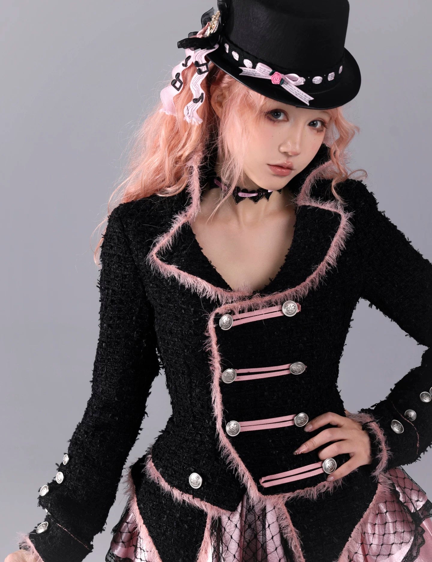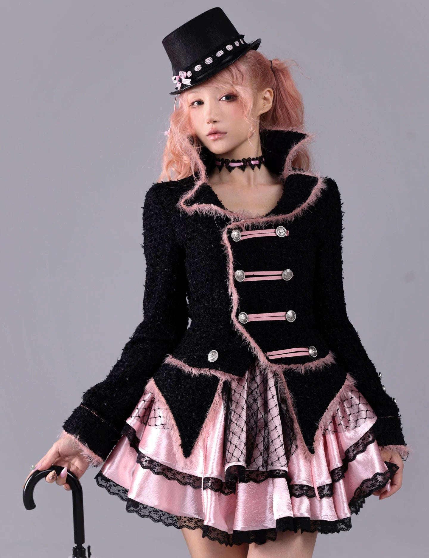 Two girls wearing matching pink and white outfits with cat ears faux fur fluffy cape front view
