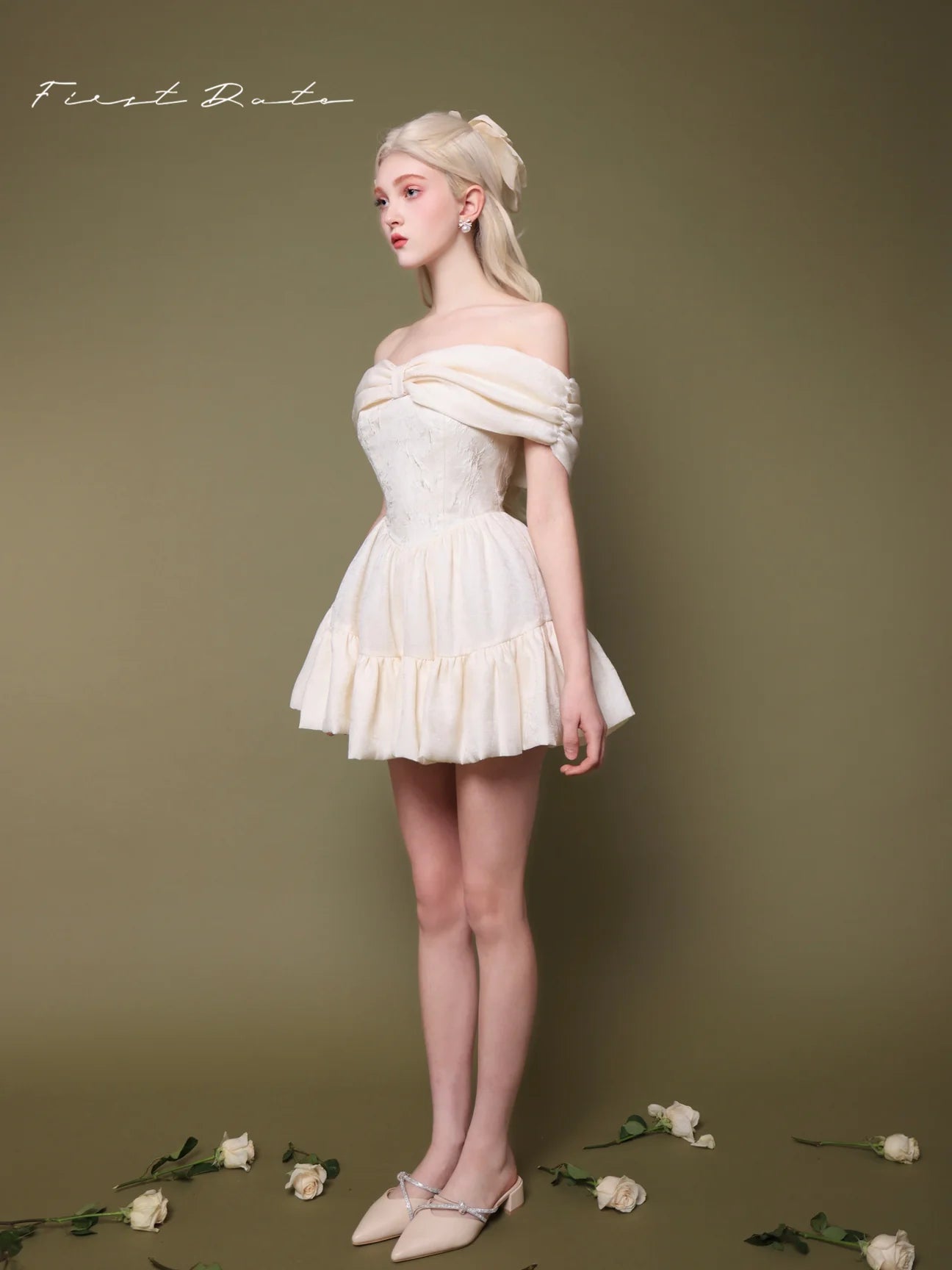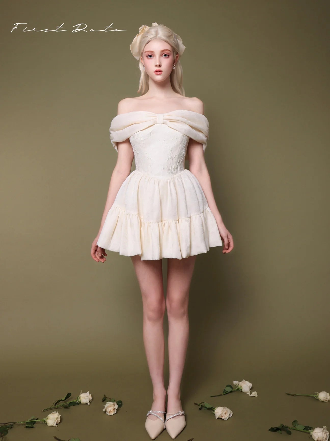 This dress features an off-shoulder neckline with a charming bowknot bustier, capturing the essence of romantic styling. The wide A-line skirt cascades gracefully, offering a voluminous silhouette that emphasizes movement and grace. A distinctive inverted triangle design at the waist accentuates the slimmest part of the torso, enhancing the natural hourglass figure. Each element combines to craft a gown that's as breathtaking as it is wearable, perfect for special occasions where making a memorable impression is key.