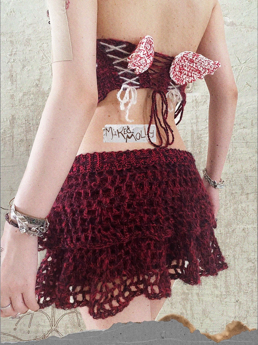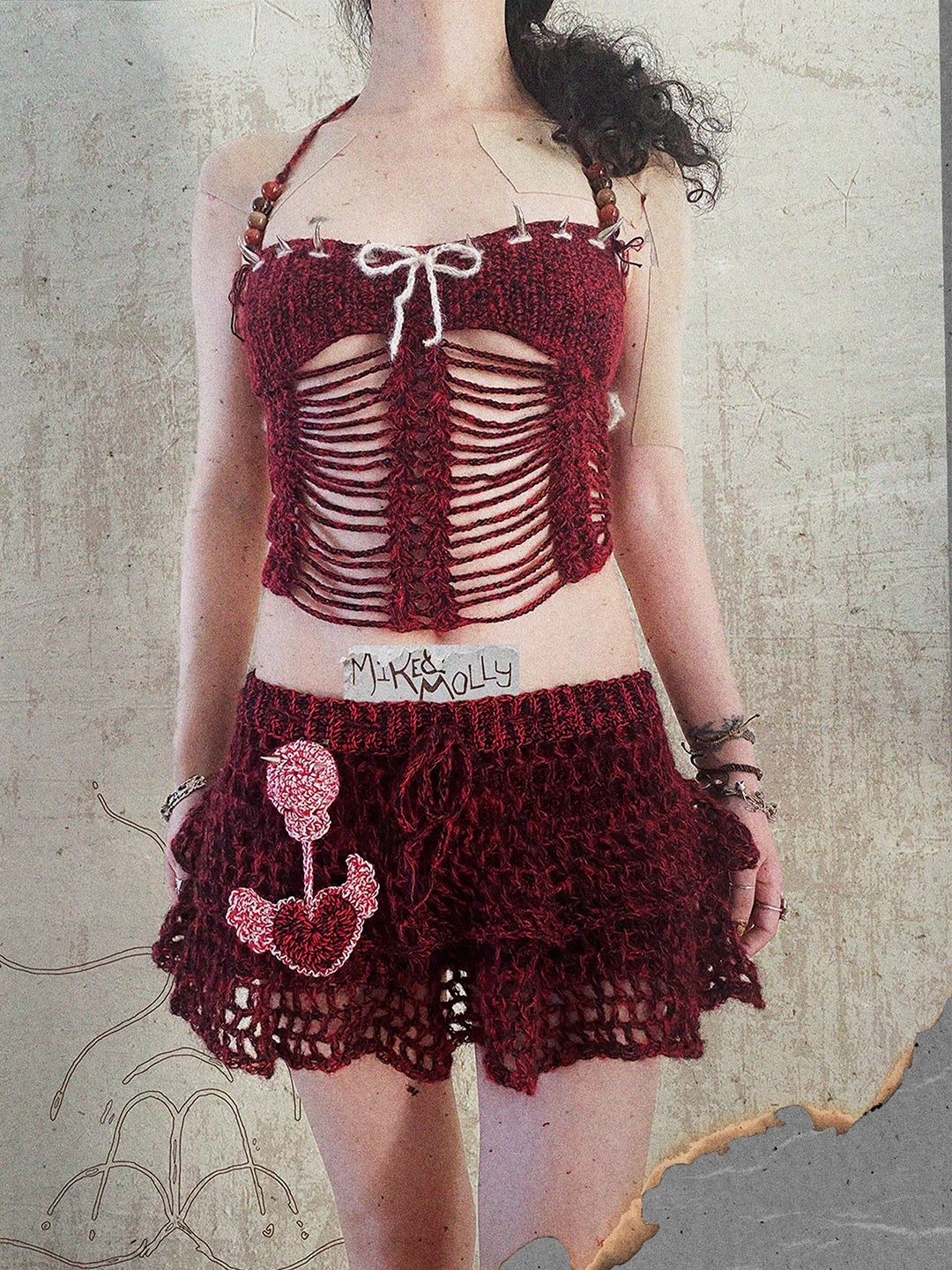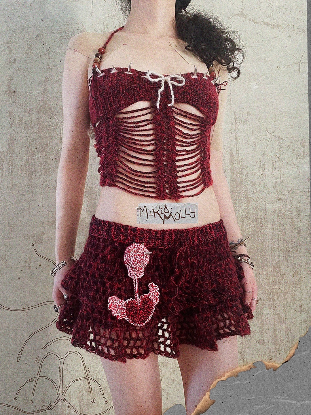 Woven from threads the color of ripe blood berries, this hand-knitted corset top carries the whispers of an ancient forest. Legends tell of a wandering witch who spun her magic into yarn, binding freedom and defiance into every stitch. When you wear it, you don’t just put on a garment—you step through a hidden door into a twilight world, where shadows dance with moonlight and every heartbeat hums with enchantment.