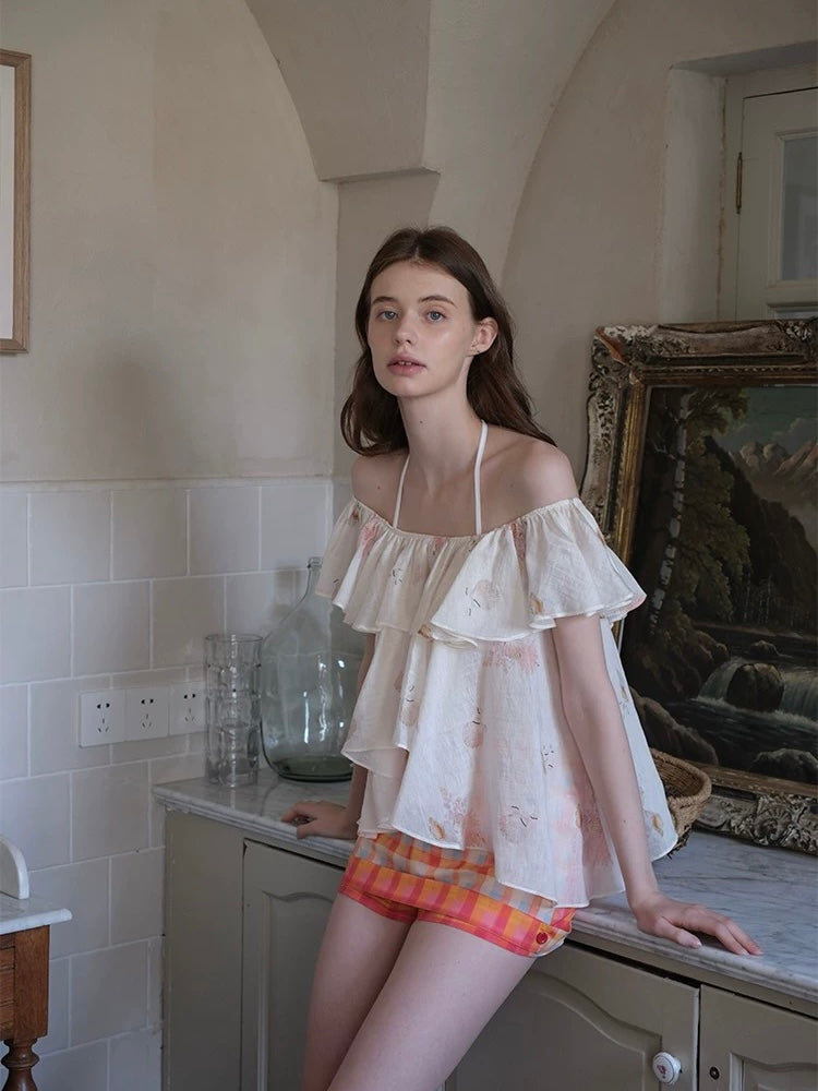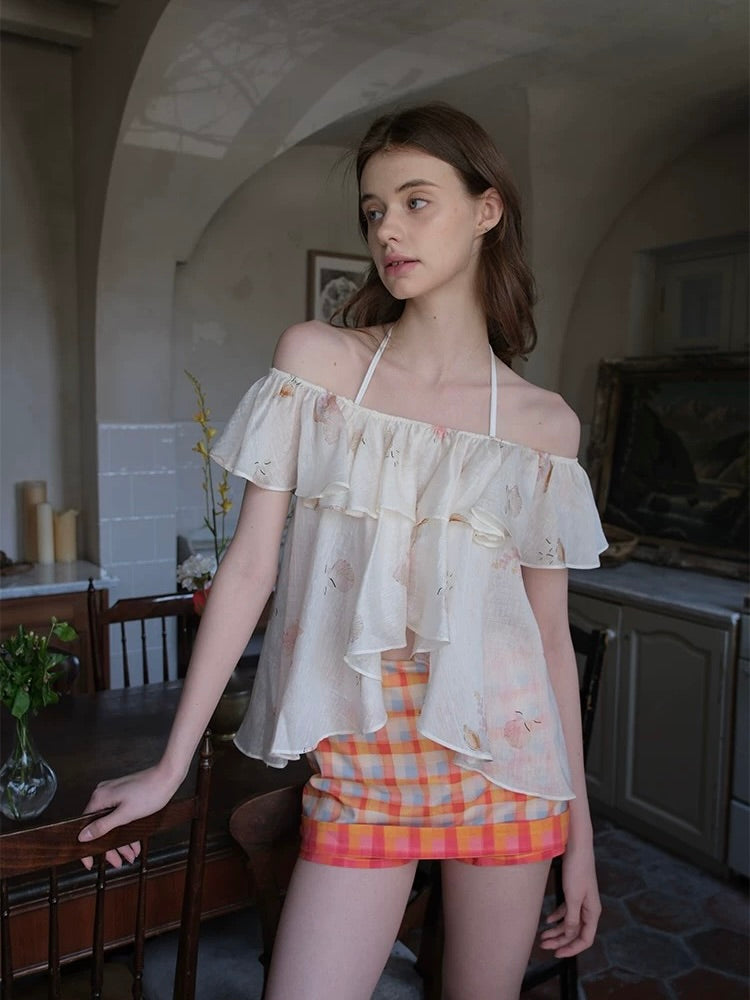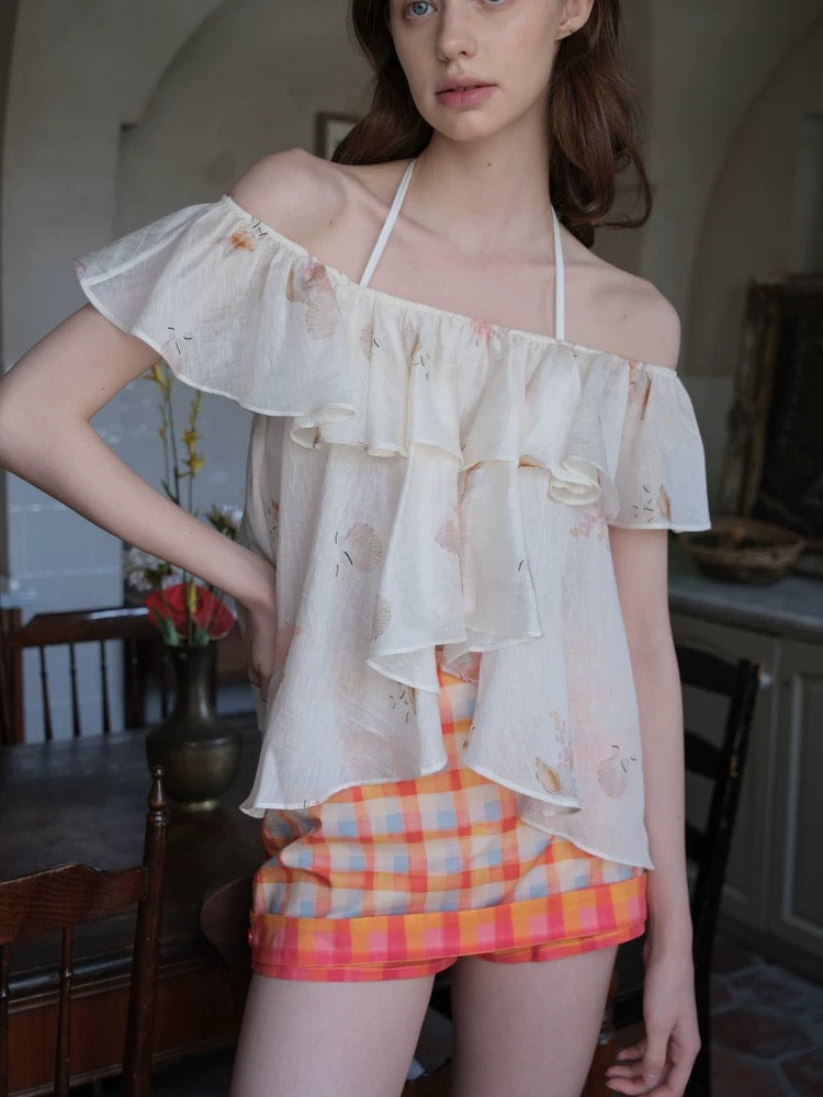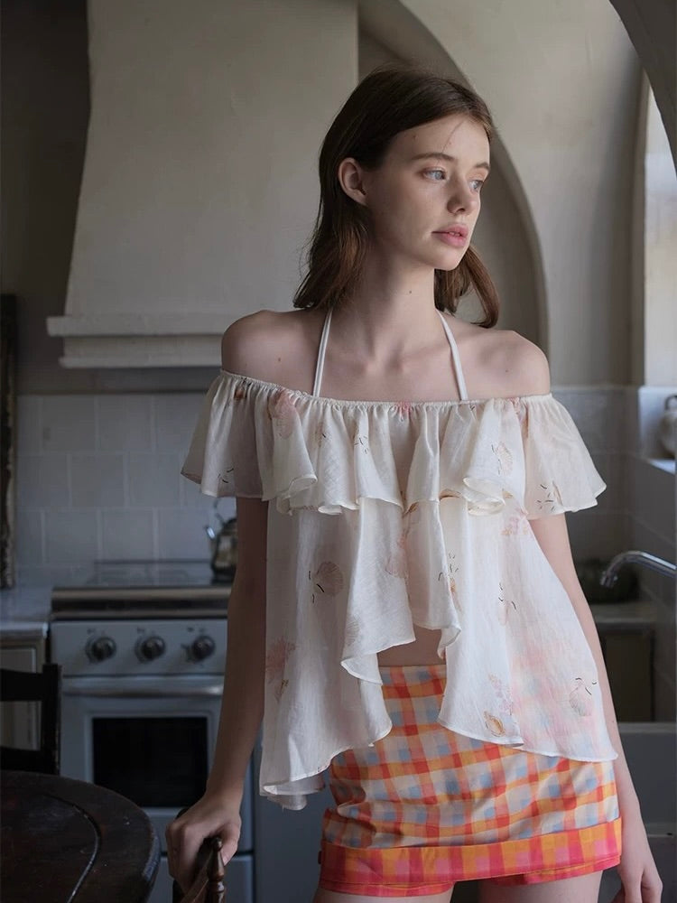 This off-shoulder cutie features a soft seashell print on silky-light fabric (66% lyocell) with a gentle glow.