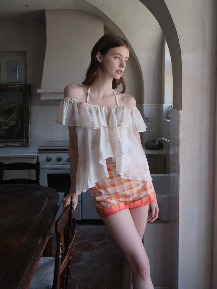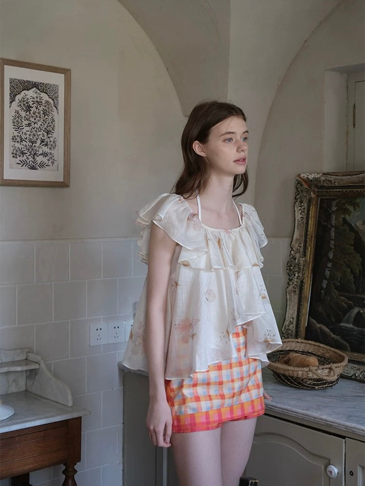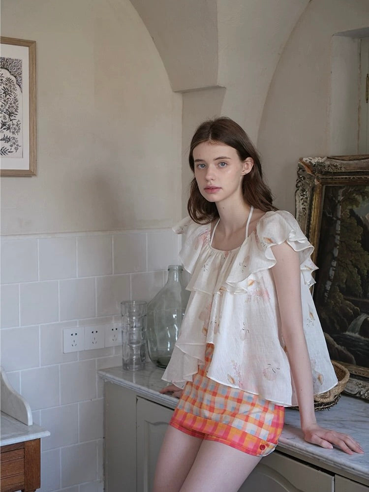 The ruched texture and ruffle trim give it a cute, layered look, while double mesh adds a soft, semi-sheer touch.