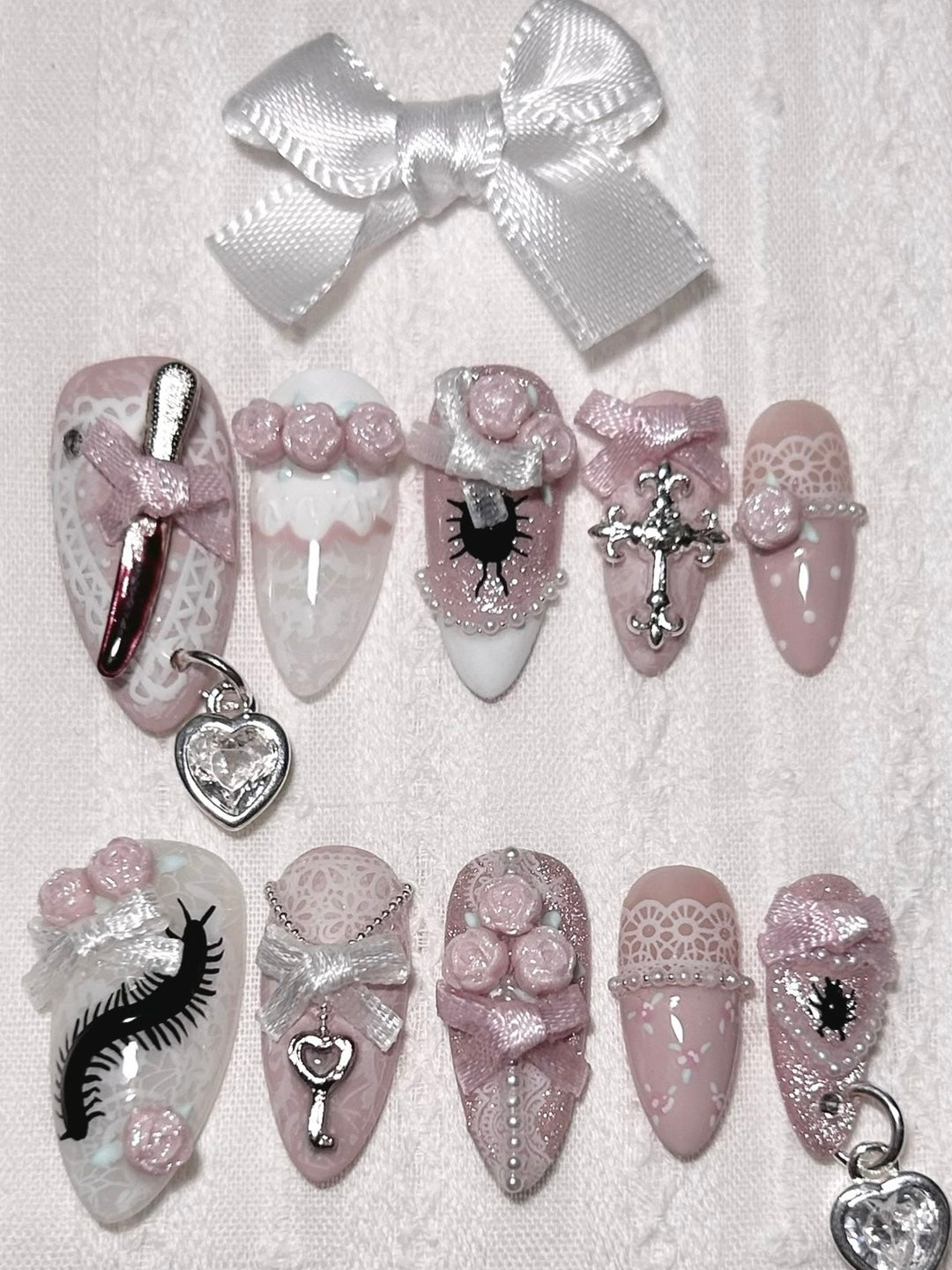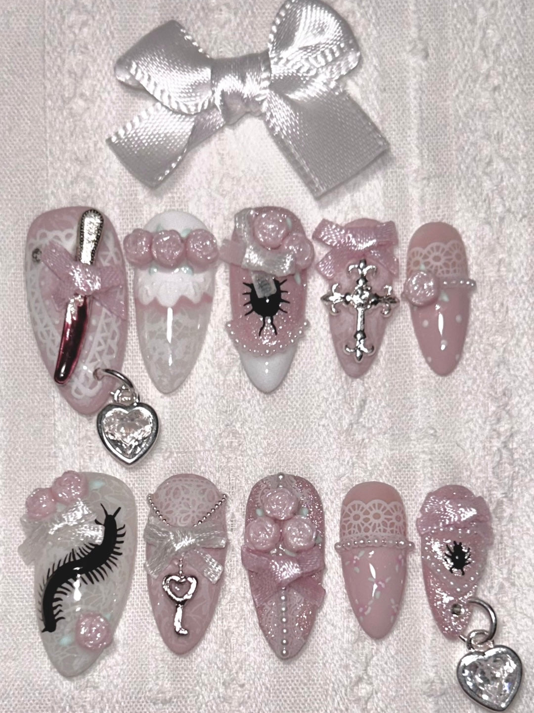 𖥔 ♡ Each nail is carefully designed, layered, and decorated with charms, lace, and hand-drawn motifs.