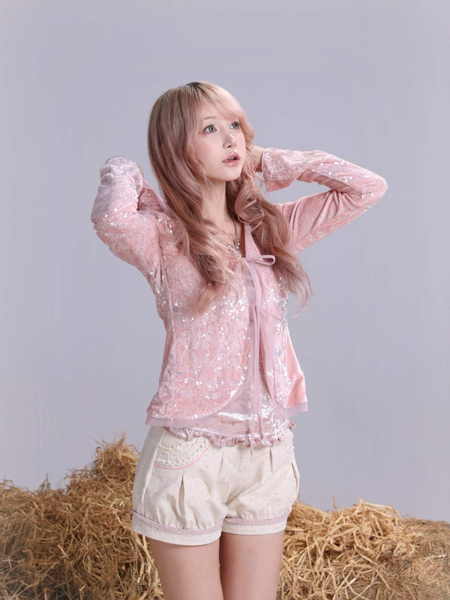 These shorts are designed for soft days of comfort. Speckled fabric adds a natural, cozy texture, while lace trim and delicate pleats bring a gentle vintage charm.