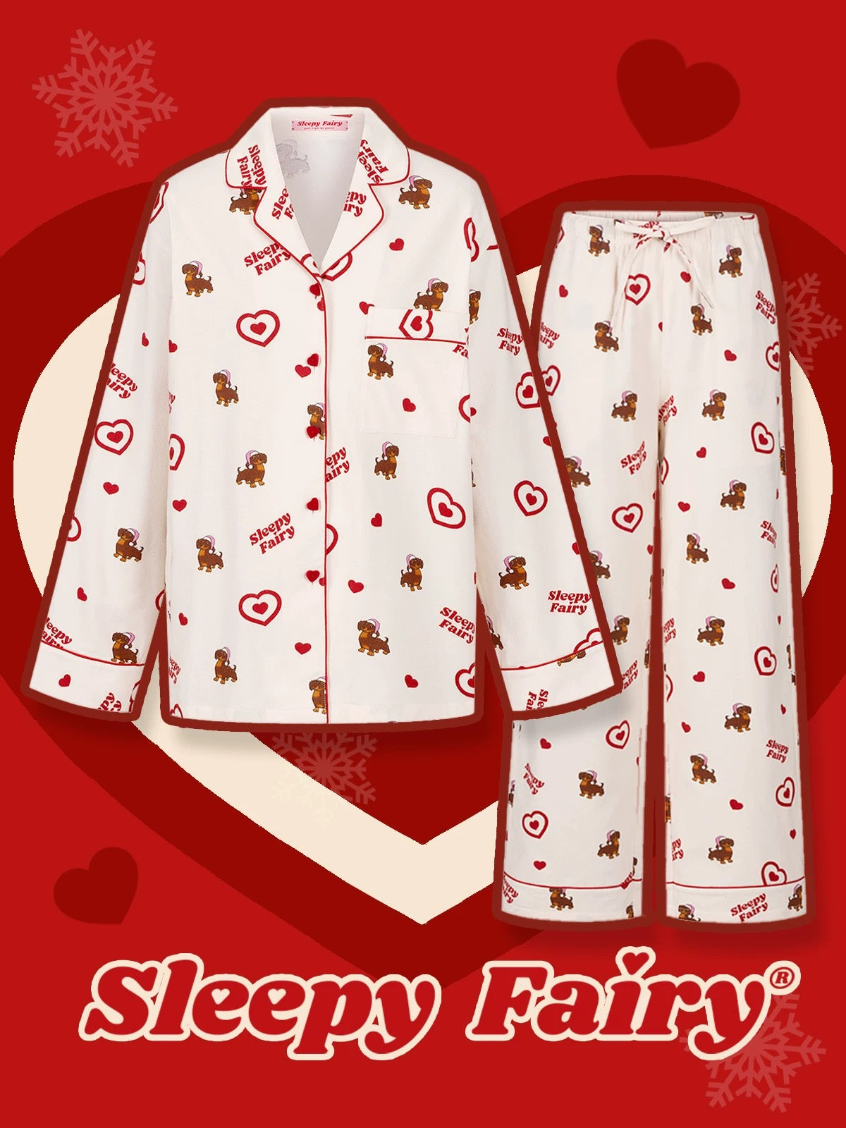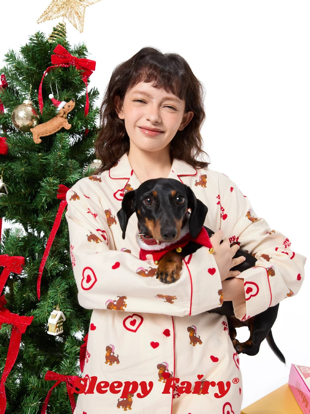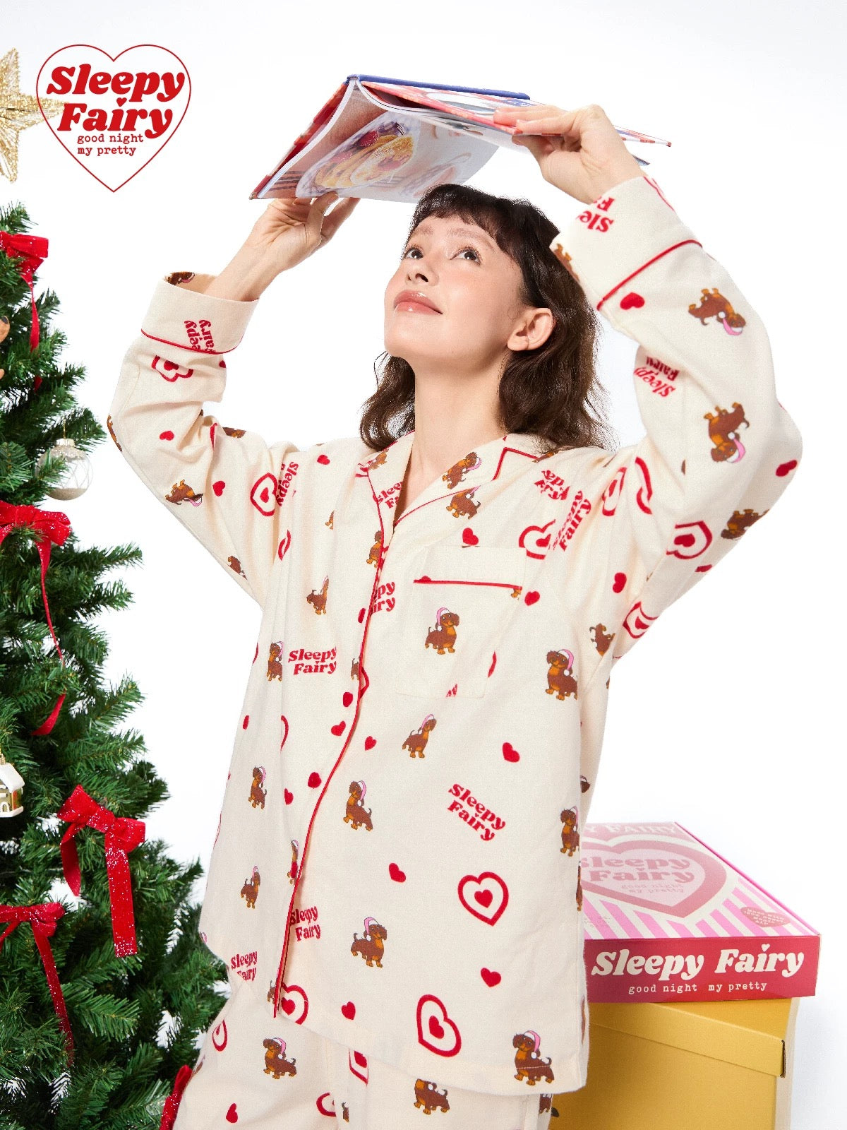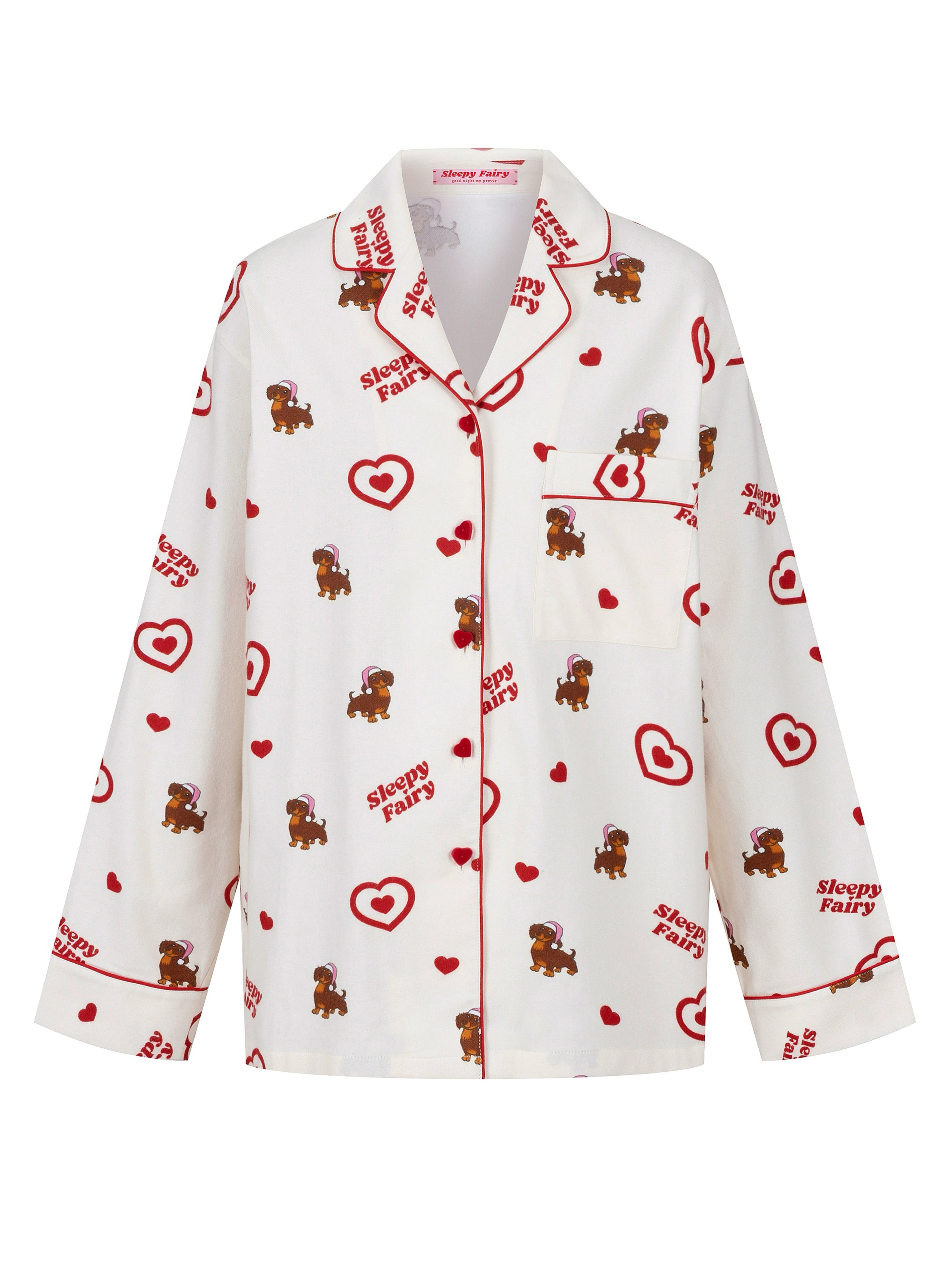 A warm and charming be loved holiday season pajama set from Sleepy Fairy, featuring an original dachshund and heart print. Made from pure cotton brushed flannel, this set feels soft, cozy, and gently warm against the skin. Finished with classic piping, a button-up top, and a relaxed fit for everyday comfort.