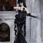 The sweetheart neckline frames the décolletage with a ceremonial shimmer, while detachable ruffle drapes at the hips add baroque flourish to the form. Each curve is traced in silver-threaded fabric, balancing gothic allure with architectural poise.