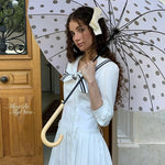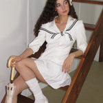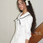 A dreamy nod to vintage schoolgirl charm, this crisp white pleated dress features a striking angled sailor collar edged with navy stripes and a dainty bow tie.