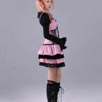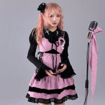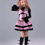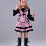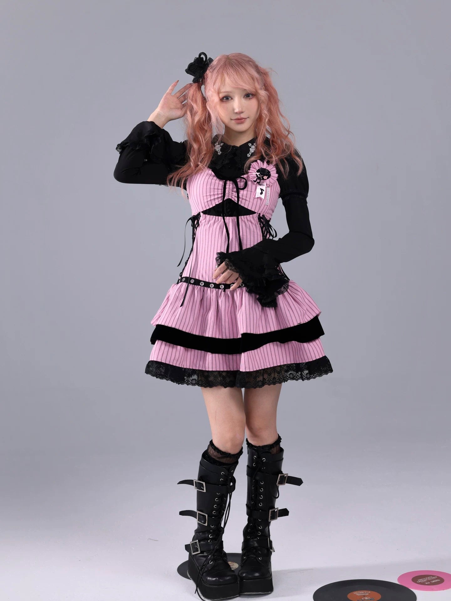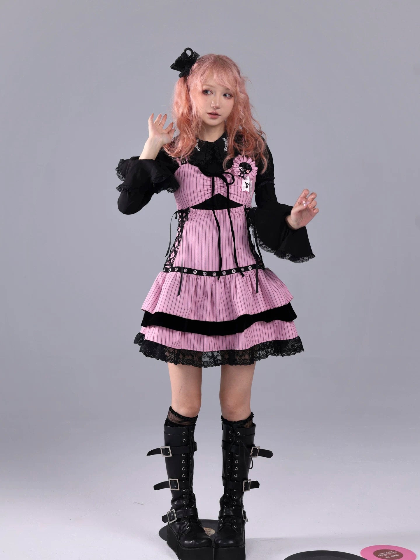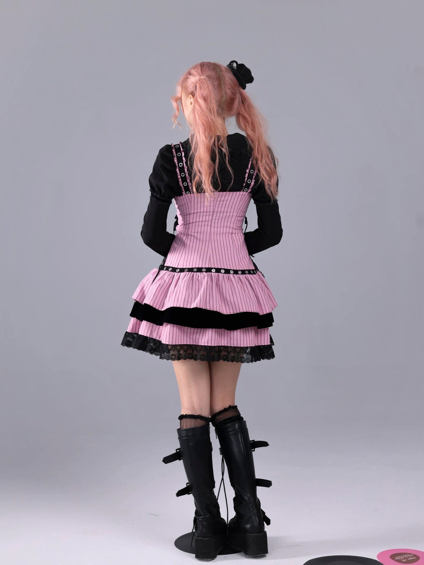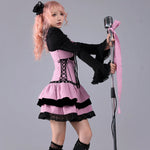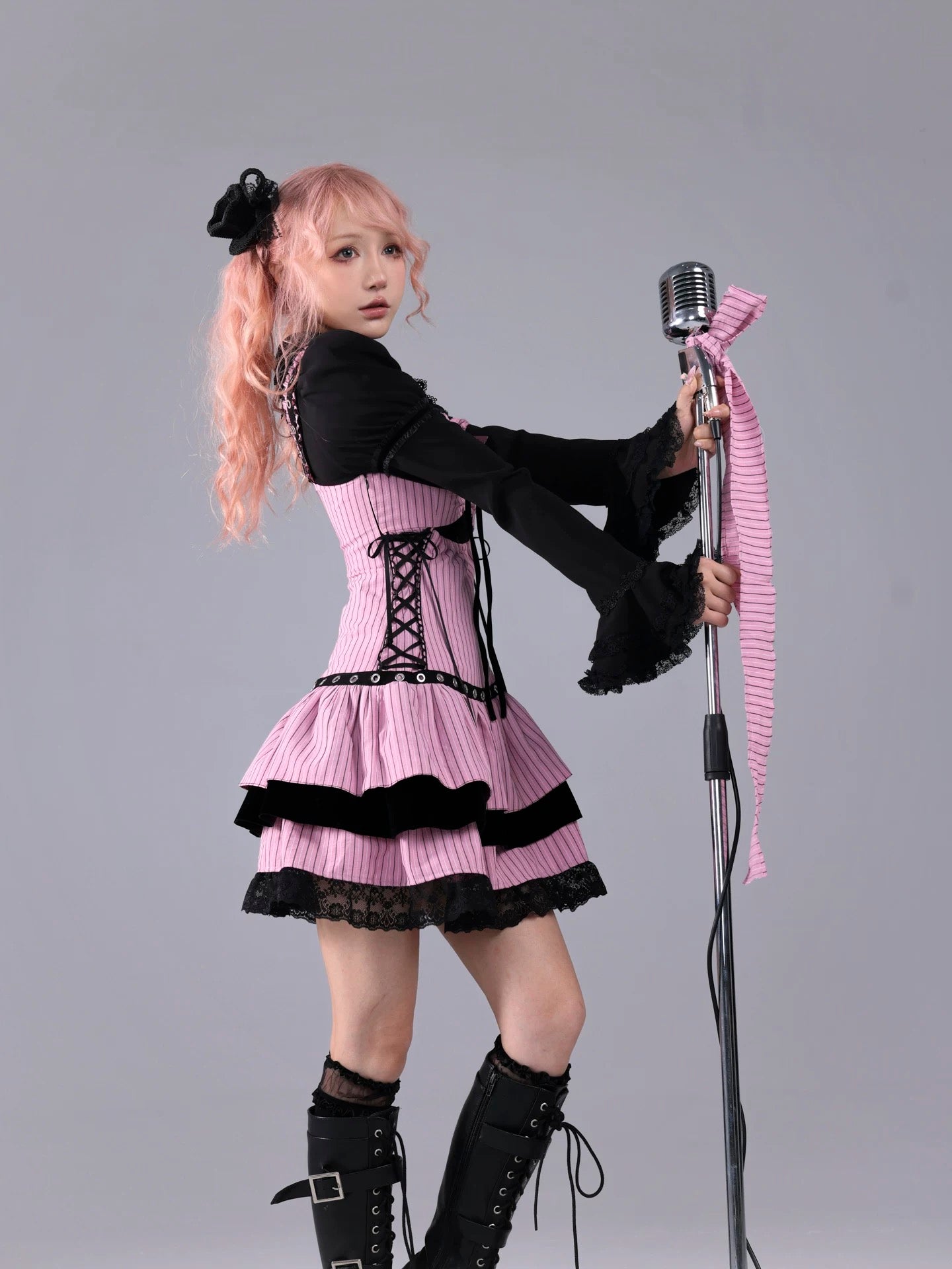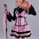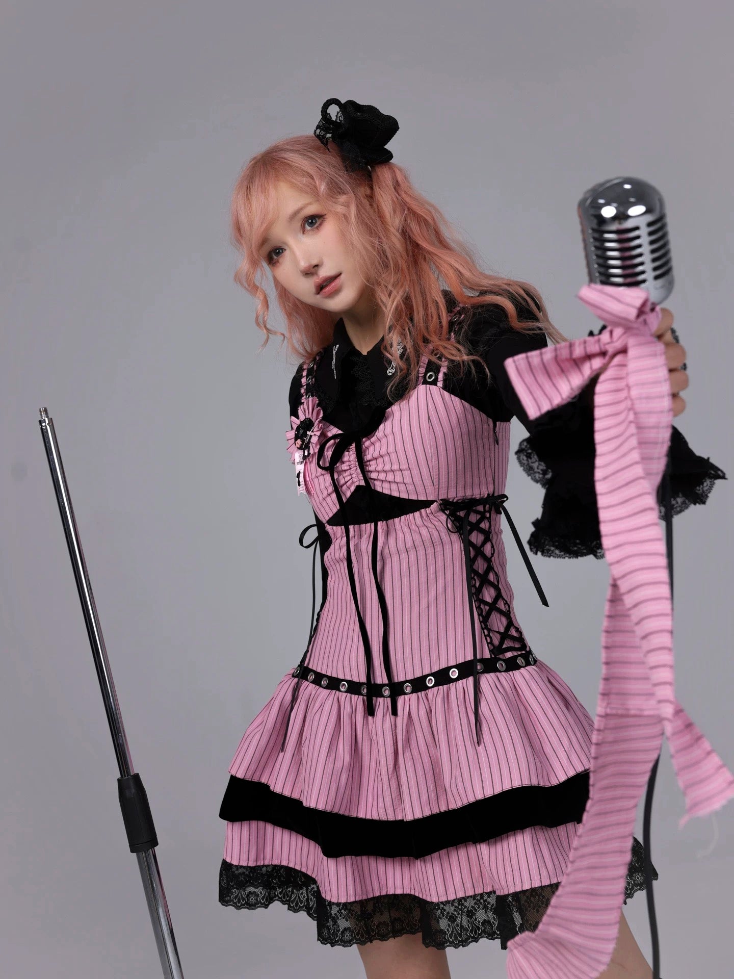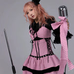 A pink-and-black striped stage dress that looks like it stepped straight out of a live house — where gothic idol, rock band vocalist, and Harajuku street fashion all meet. Metal eyelets, lace-up sides, and layered velvet frills create a high-energy look made for microphones, spotlights, and encore calls.