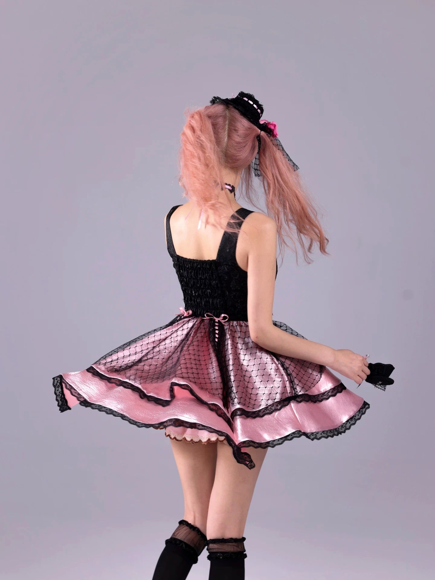 スカート部分はクチュール並みの手間をかけた特別仕様。サテンとメッシュの三段フレアを一段ずつ角度調整し、動くたびにふわりと広がる美しいボリュームを形成。上から重ねたブラックメッシュがステージライトで宝石のような輝きを放ちます。リボンやレースも一つ一つ丁寧に配置され、量産では難しい完成度に仕上がっています。