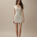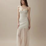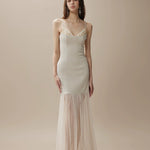Featuring a sculpted bodice with embroidered floral tulle at the bust, the dress glows with quiet charm. The lower half unfolds into a flowing sheer overlay that drifts with lightness, evoking a dreamlike presence with every movement.