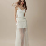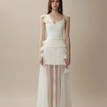 A dreamy transition from solid satin to an ethereal tulle skirt reveals the legs beneath like morning mist, adorned with handcrafted floral appliqués—each petal stitched with devotion. The semi-sheer layer sways with each step, painting a living canvas of blossoming movement.