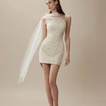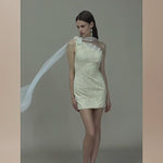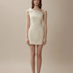 Step into an ethereal dream with the “Whispers of Tulle” dress – an elegant asymmetrical mini dress crafted in soft ivory lace interwoven with subtle gold threads. This delicate piece glows with a gentle sheen that flows like morning mist over a quiet garden.