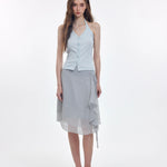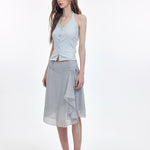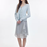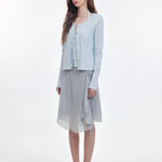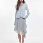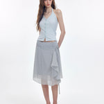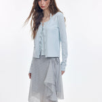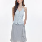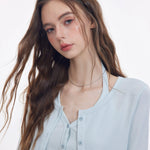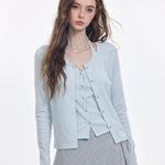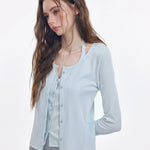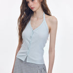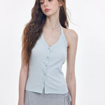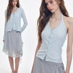 The Misty Sky Set by Reabobo is your go-to outfit for transitioning between summer and fall. Featuring a baby blue halter tank with a figure-hugging silhouette and delicate front buttons, it pairs effortlessly with the matching lightweight cardigan for chillier mornings or air-conditioned classrooms.