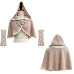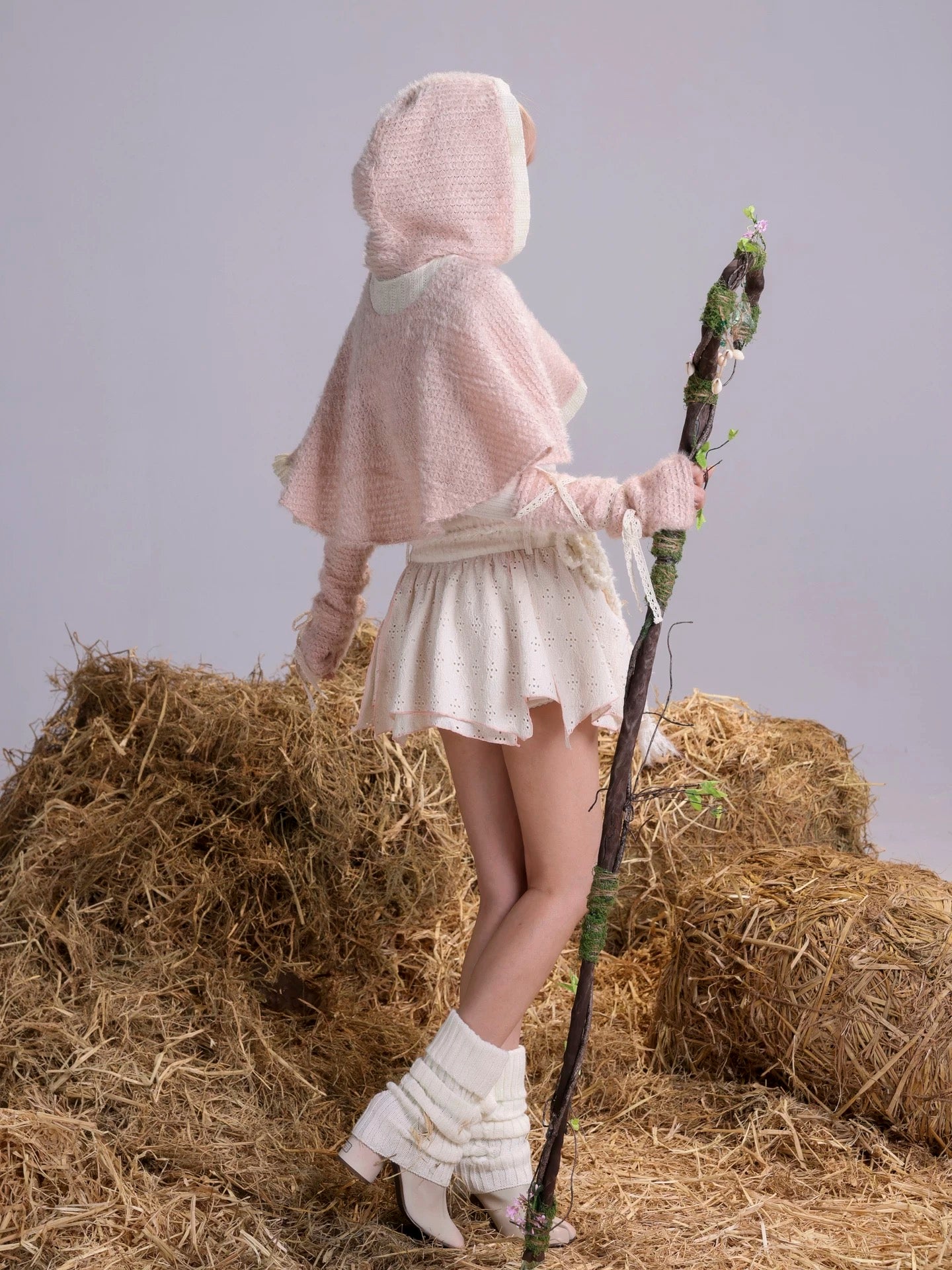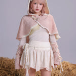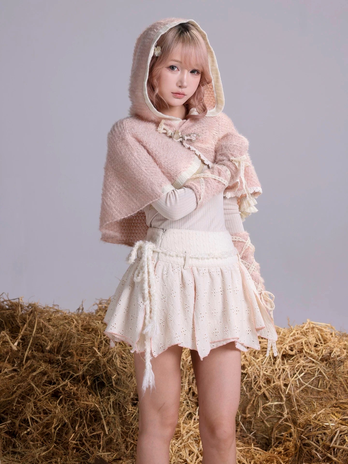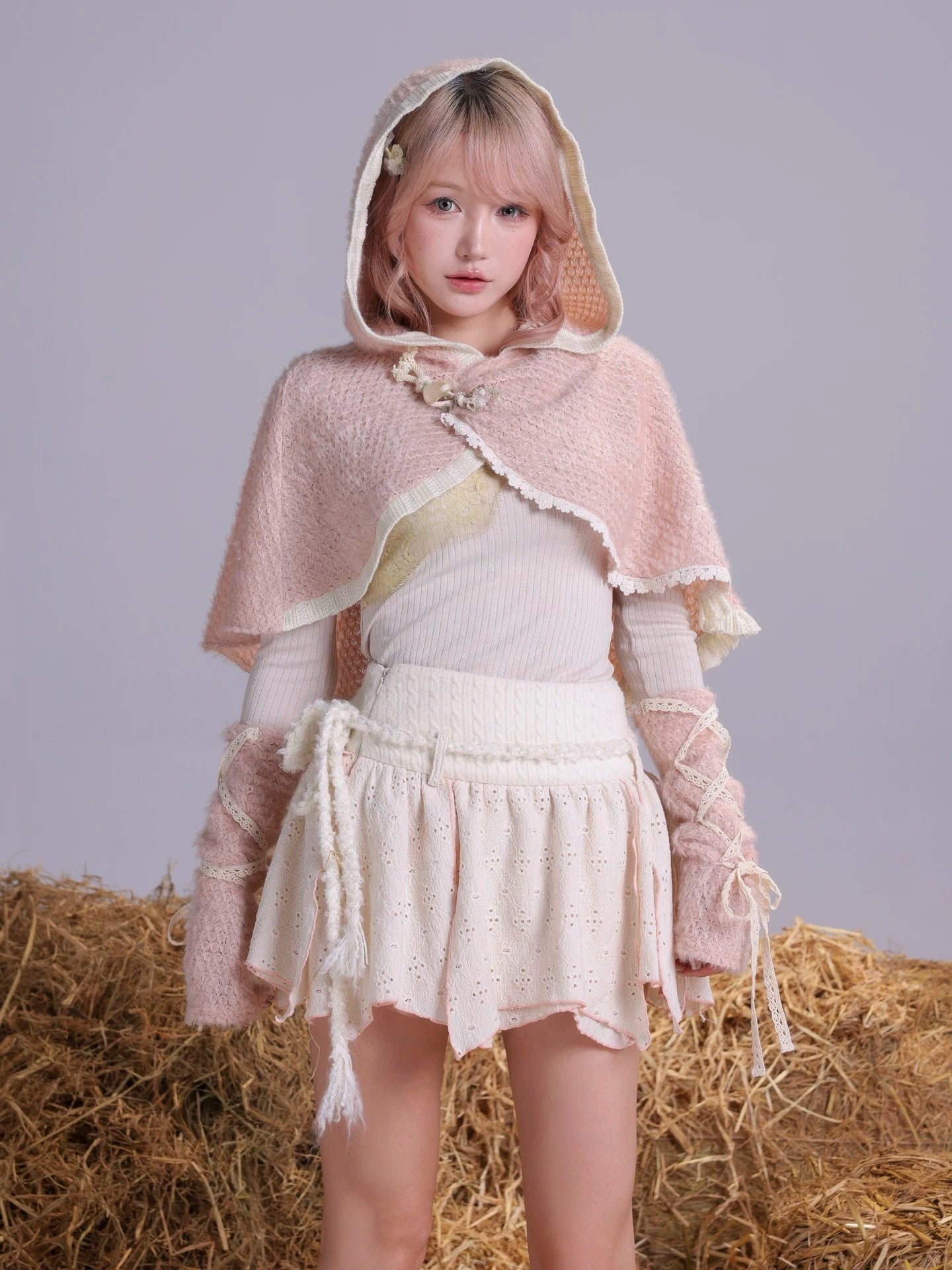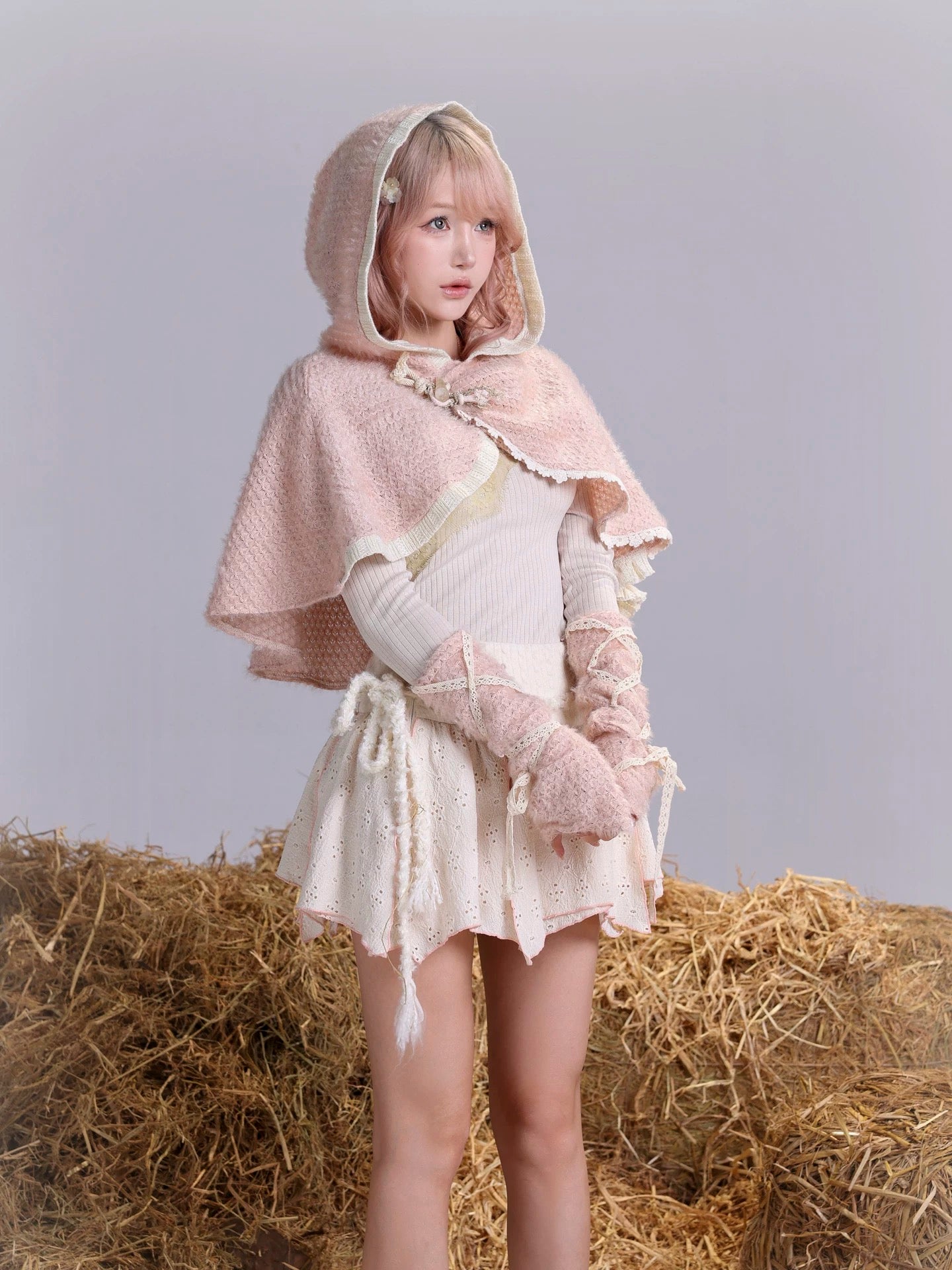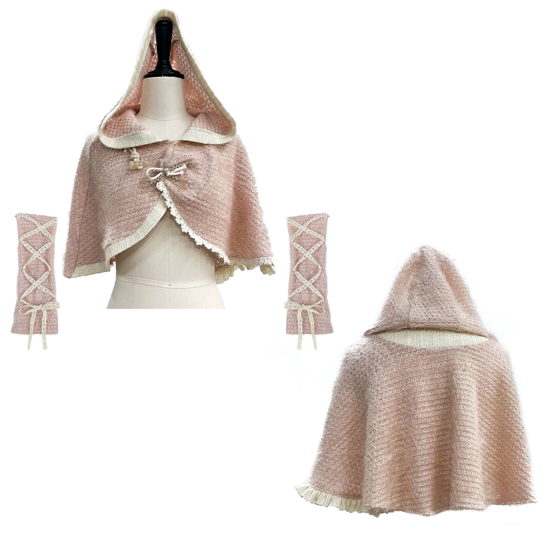 Soft as autumn clouds, this knitted cape in blush pink carries a gentle, storybook charm. The fluffy mohair-touch knit feels light yet warm, while delicate lace trims and ribbon ties whisper of woodland magic. With its matching lace-up cuffs and hood design, this piece captures the spirit of forest elves—innocent, cozy, and a little mysterious.