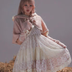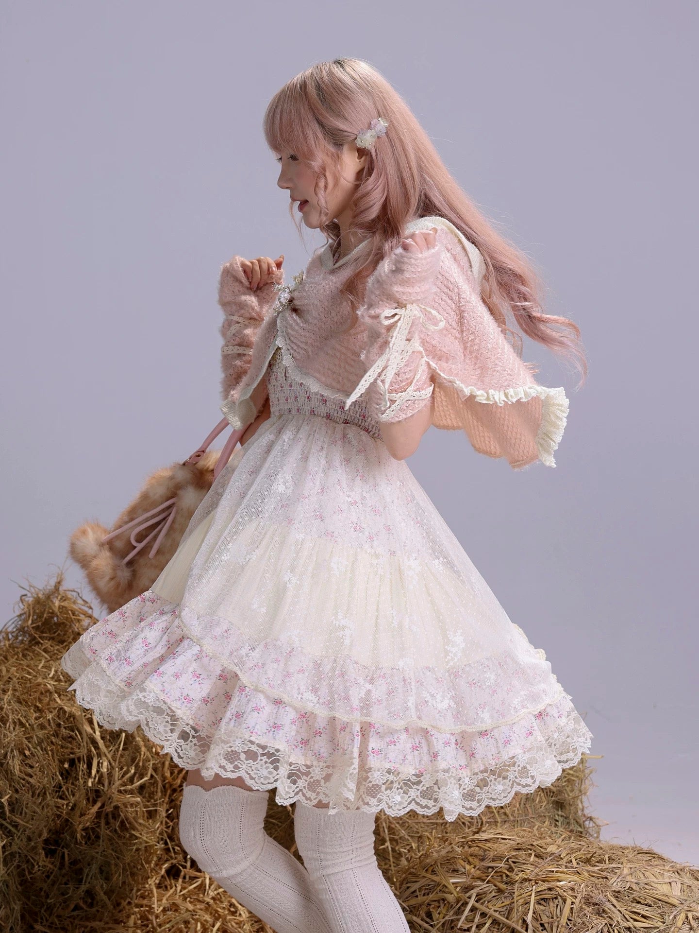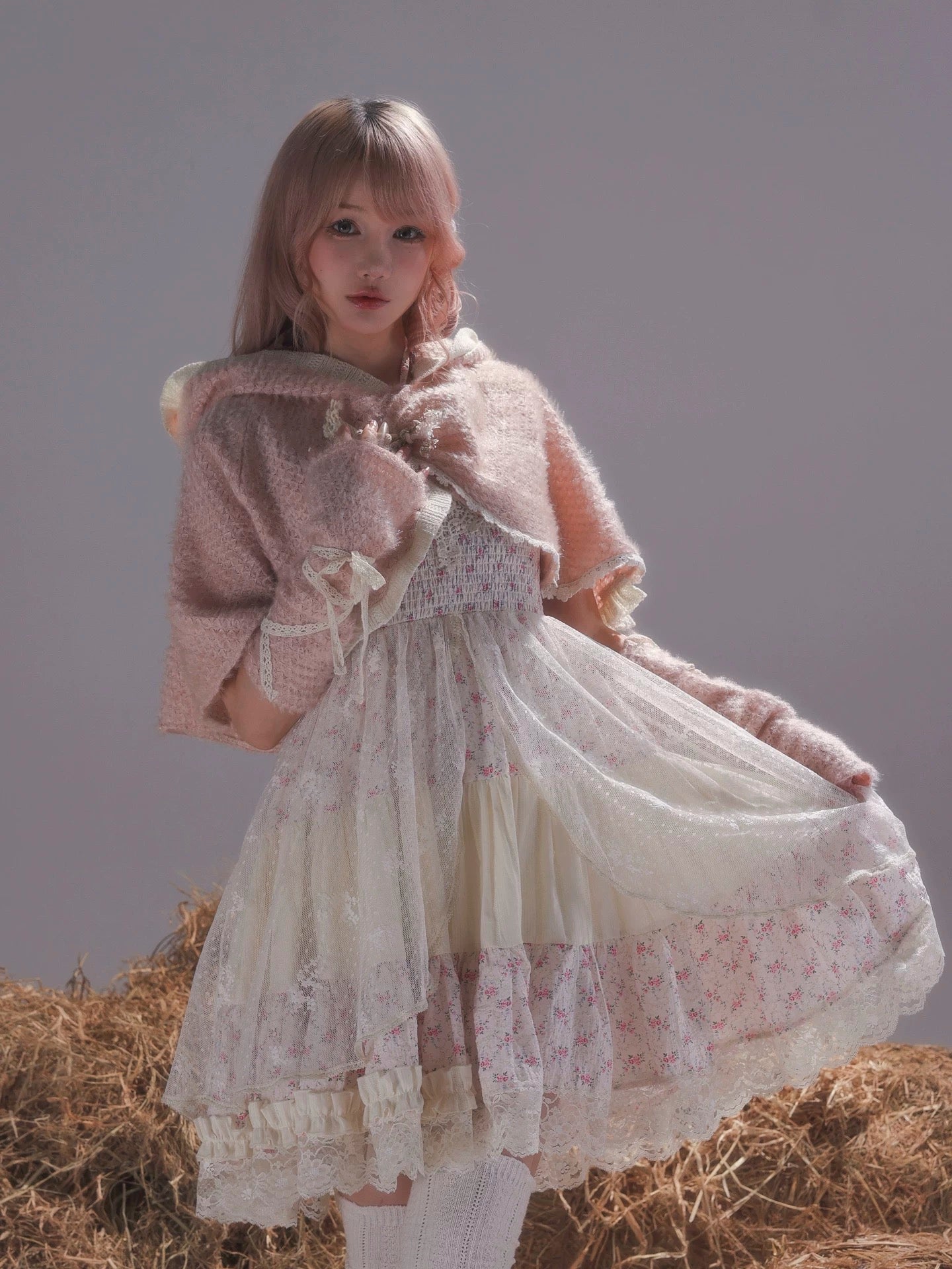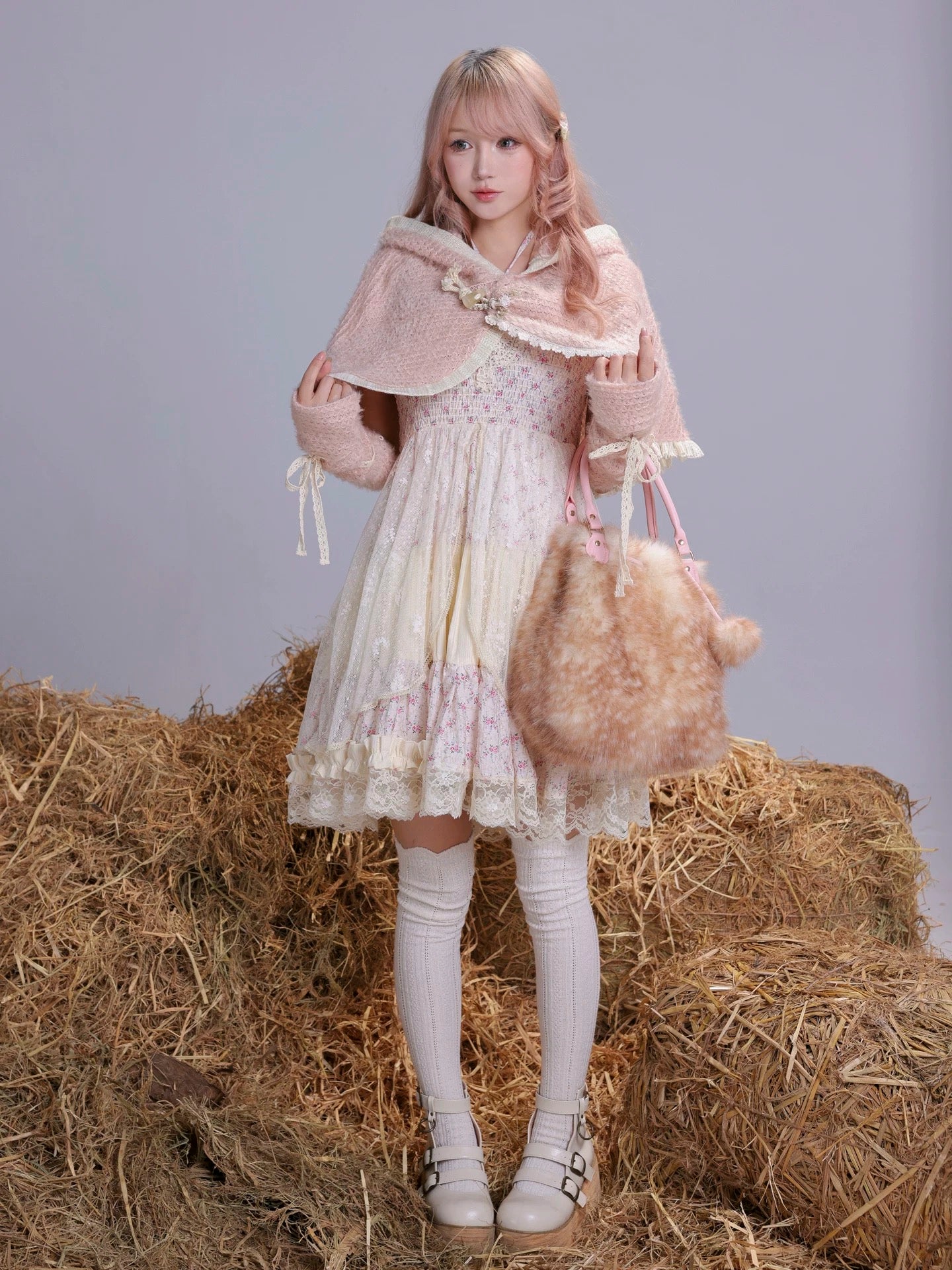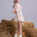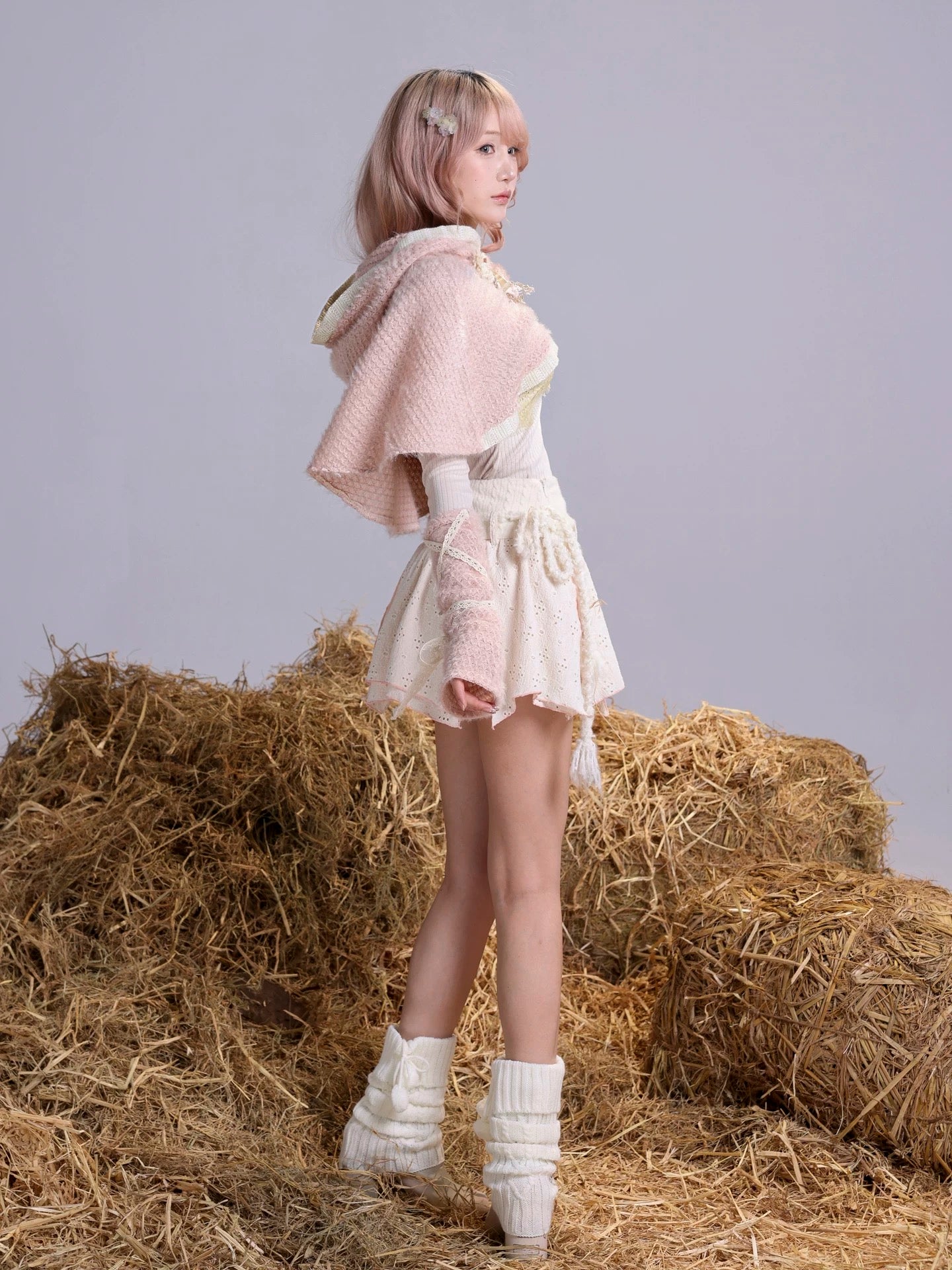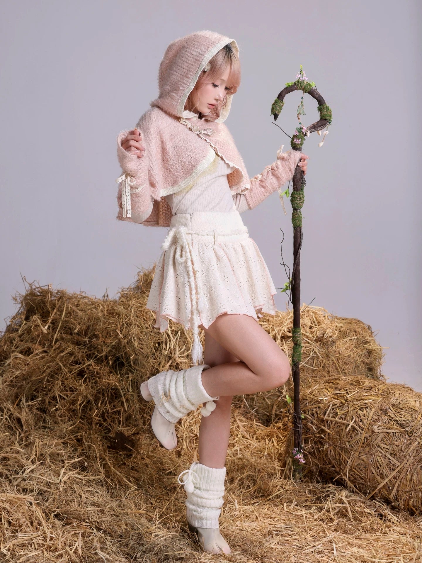 Soft as autumn clouds, this knitted cape in blush pink carries a gentle, storybook charm. The fluffy mohair-touch knit feels light yet warm, while delicate lace trims and ribbon ties whisper of woodland magic. With its matching lace-up cuffs and hood design, this piece captures the spirit of forest elves—innocent, cozy, and a little mysterious.