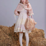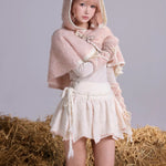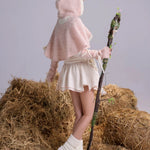 Soft as autumn clouds, this knitted cape in blush pink carries a gentle, storybook charm. The fluffy mohair-touch knit feels light yet warm, while delicate lace trims and ribbon ties whisper of woodland magic. With its matching lace-up cuffs and hood design, this piece captures the spirit of forest elves—innocent, cozy, and a little mysterious.