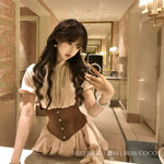 The top features delicate pleating and a refined mandarin collar, paired with pearl buttons for a touch of noble charm. The peplum waistline gently flares, enhancing the silhouette with a playful yet polished feel. The skirt’s built-in lace-trimmed safety shorts add both security and sweetness, blooming out like a little cupcake when you twirl.