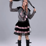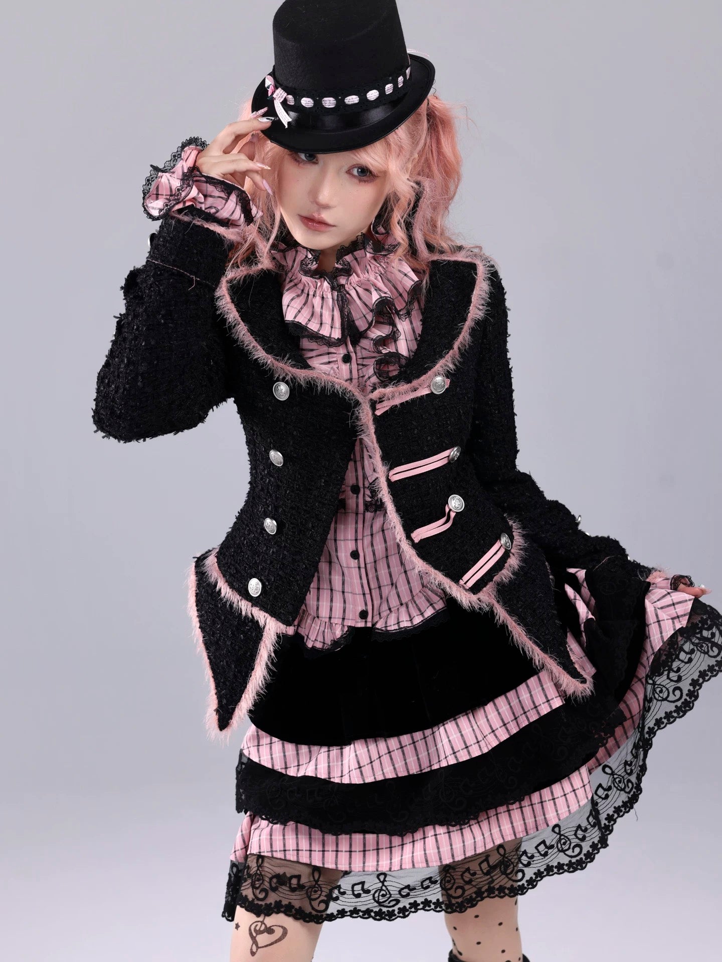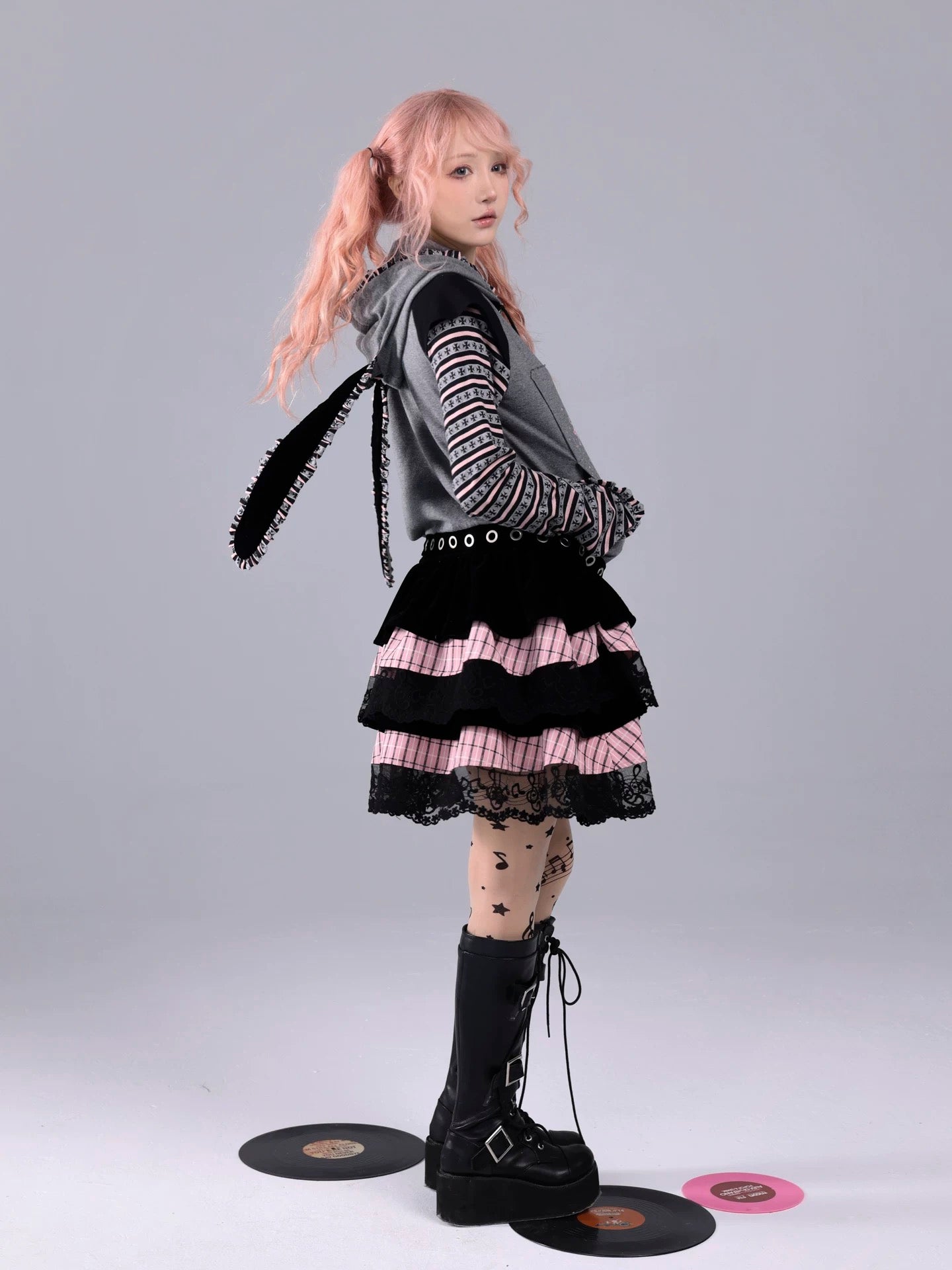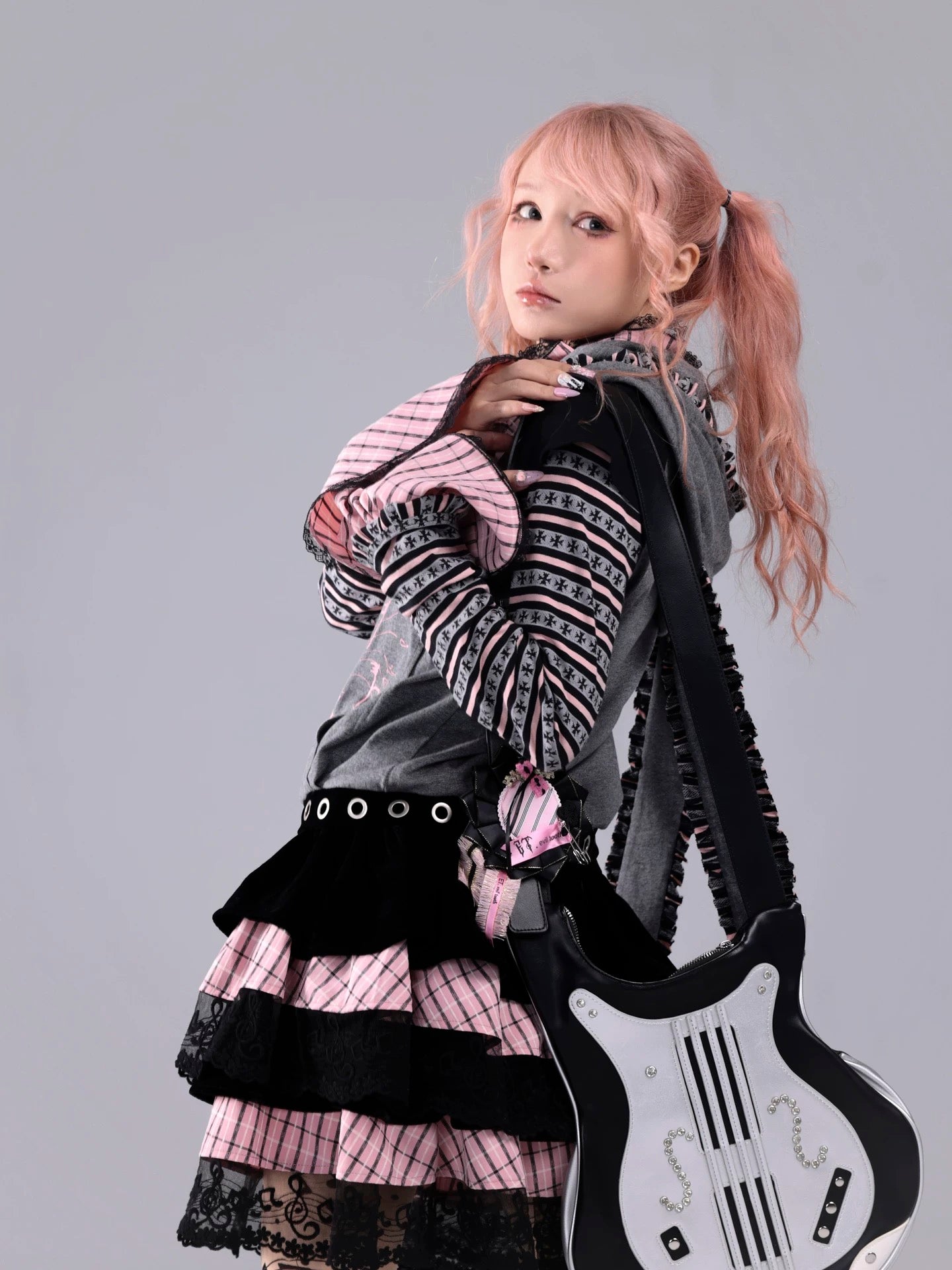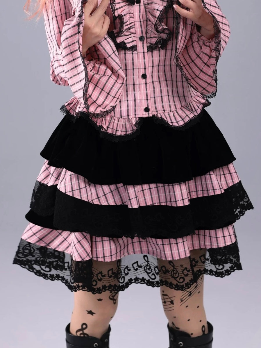 A four-tiered skirt inspired by classical symphonies, Harajuku street idols, and gothic punk rock bands. The layered velvet, plaid fabric, and embroidered musical-note lace create a visual rhythm that feels like a moving performance — nostalgic, sweet, and rebelliously dark.
