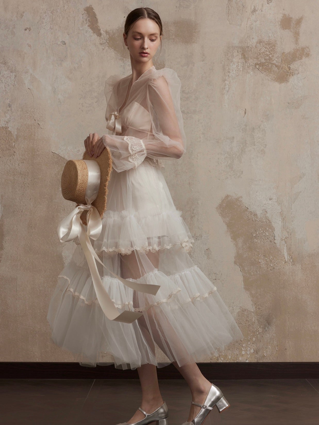 The Moonlit Veil Midi Skirt drapes like moonlight over the night, with its flowing tulle layers exuding ethereal elegance. Delicate sheer fabric shimmers softly, evoking a poetic dream of mystery and grace. Each pleated layer dances with the light, creating a mesmerizing interplay of movement and tranquility.