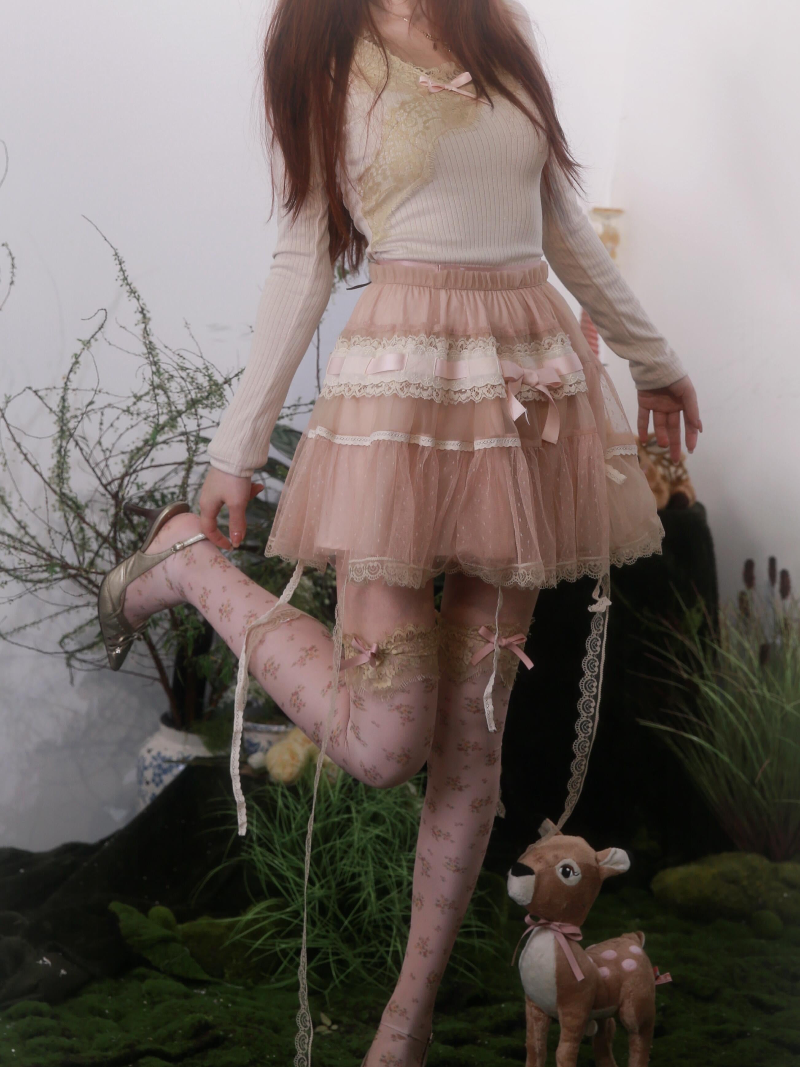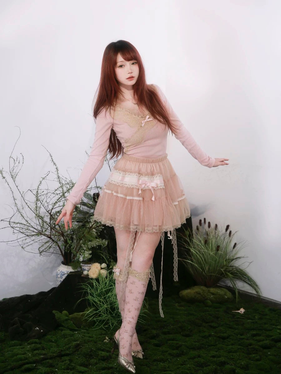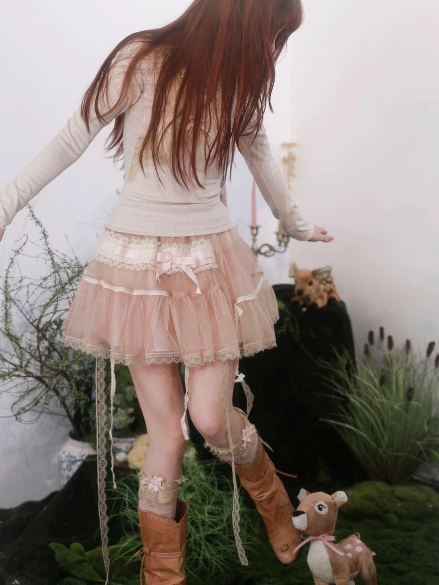 不規則にドレープされたレースは、まだ編みかけられているかのように、未完成で夢見心地な雰囲気を醸し出し、フェアリーコアの幻想的な世界観とコケットコアの優雅さを融合させています。