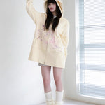 Wrap yourself in warmth and whimsy with KiraYura’s Bunny Diary hoodie — a cozy dream for soft girl autumns and dreamy spring strolls. Made from 100% pure cotton in a creamy milk yellow, this oversized zip-up hoodie features a pastel storybook-style print with magical icons, sweet ribbons, and handwritten notes that feel like they came from a secret diary.