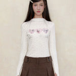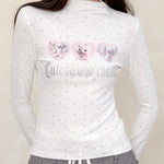 Featuring an allover baby heart print and three mischievous teddy bears inside pink hearts—one with a knife, one with attitude, and one with angel wings—this top perfectly captures the cutesy and chaotic energy. Whether you’re pairing it with a pleated skirt or wide-leg pants, it’s the ultimate Y2K-inspired look for soft girls with a twist.