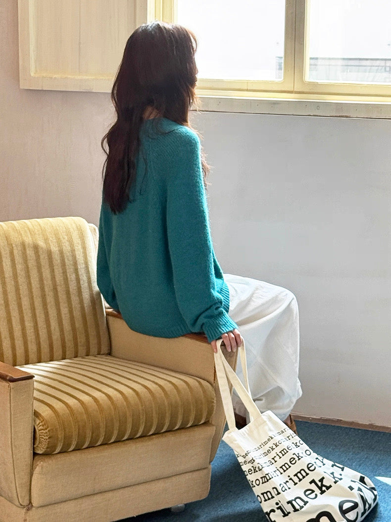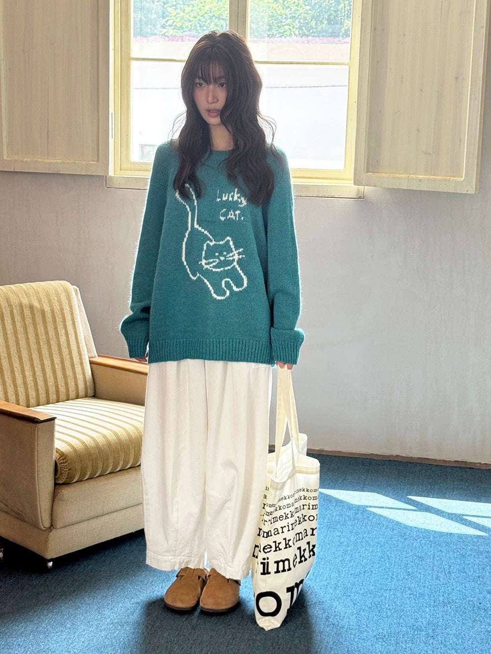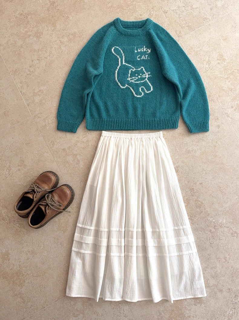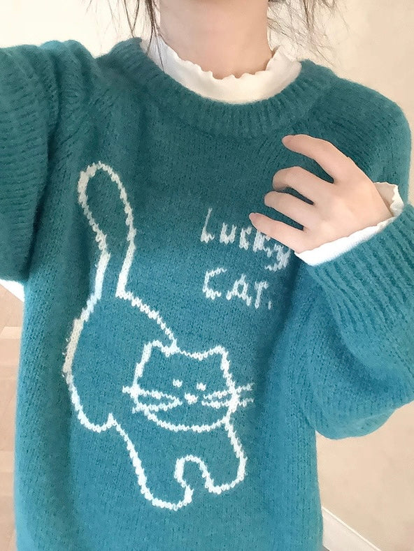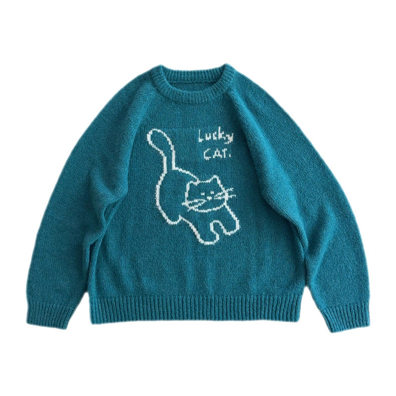A cozy knit with a playful charm — this teal sweater features a cheerful “Lucky Cat” motif, blending comfort with a lighthearted touch of whimsy. Perfect for layering over dresses, shirts, or simply wearing on its own for a relaxed, casual look.