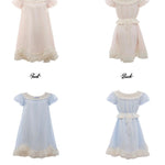 The neckline features double ruffle lace trimming, stitched in elegant symmetry and finished with a petite satin bow — an ode to coquette core aesthetics without excess. Puffy sleeves are made with inner-lining bubble technique (manches bouffantes cousues à la main), holding their whimsical shape all day long.